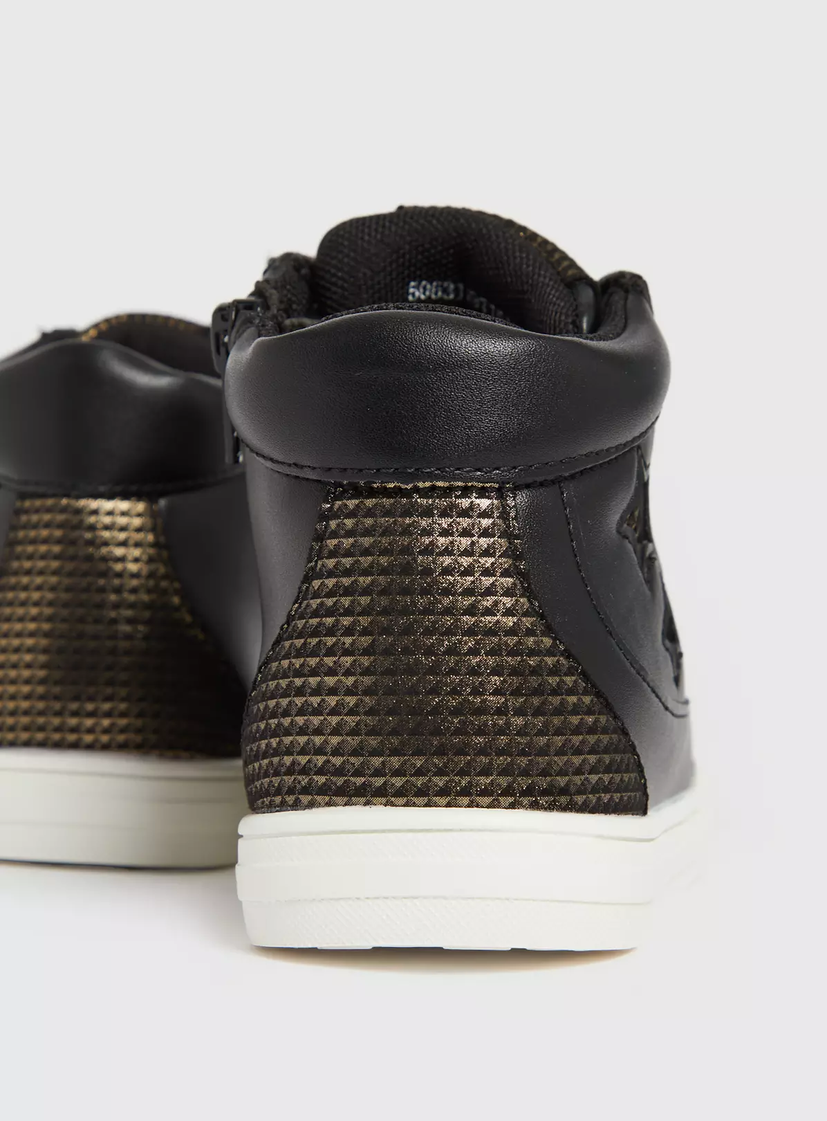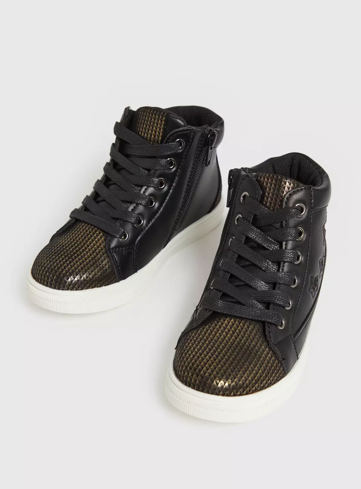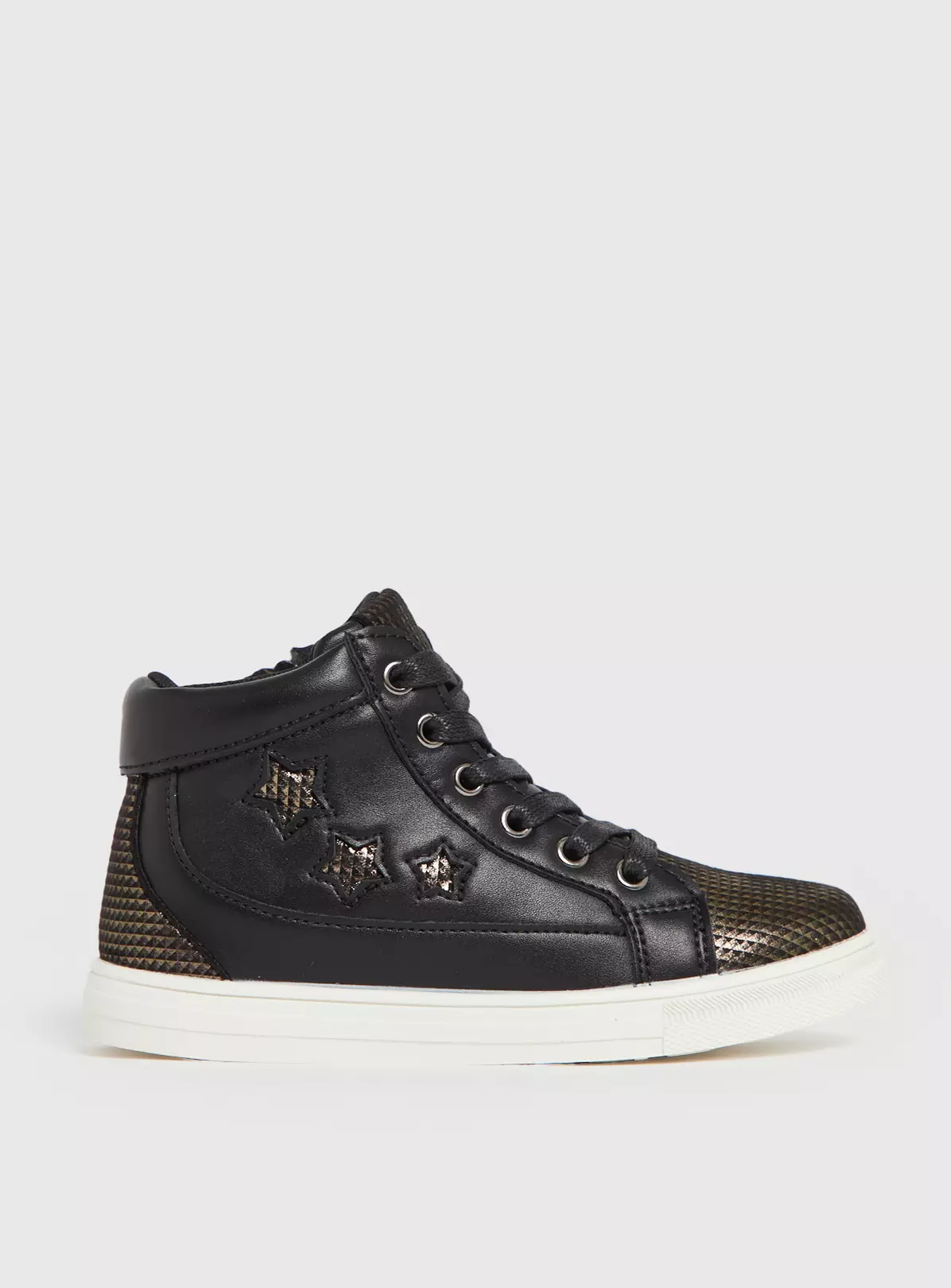 Our high top trainers come in a black faux leather upper with funky metallic gold accents with stars and are perfect for groovy little ones on the move. With a side zip, laces across the bridge of the foot, and a sporty white sole. Team with jeans and a hoodie from the full kids range at Tu.