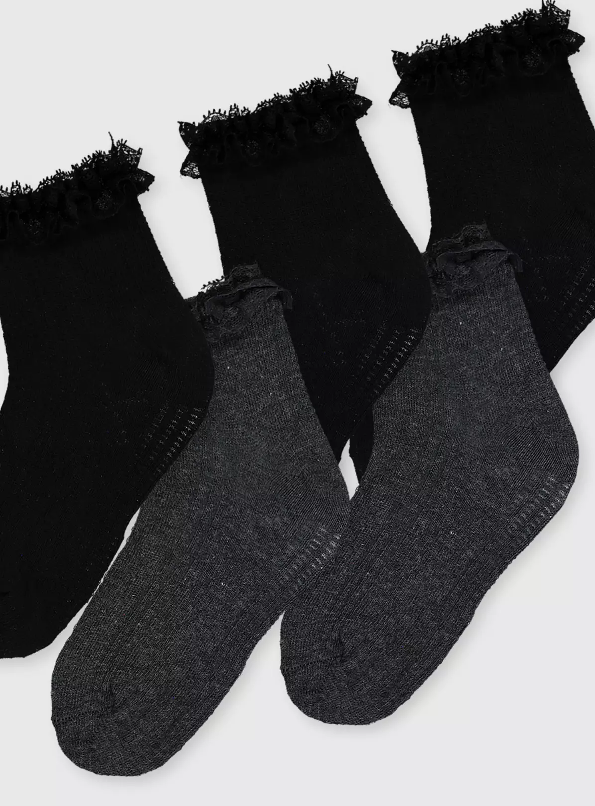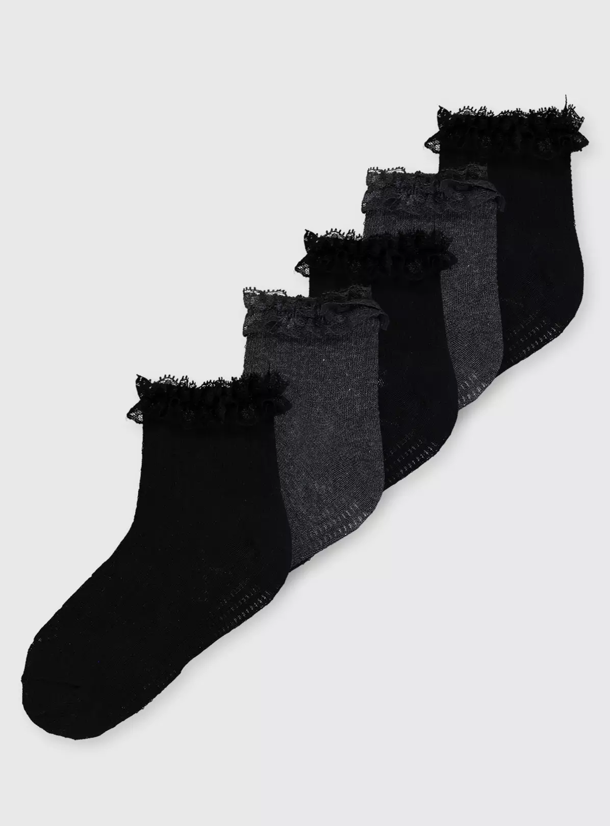 Stock up on their everyday essentials with this cotton rich pack of black and grey socks designed with a pretty lace trim. They are perfect for school and formal events.
