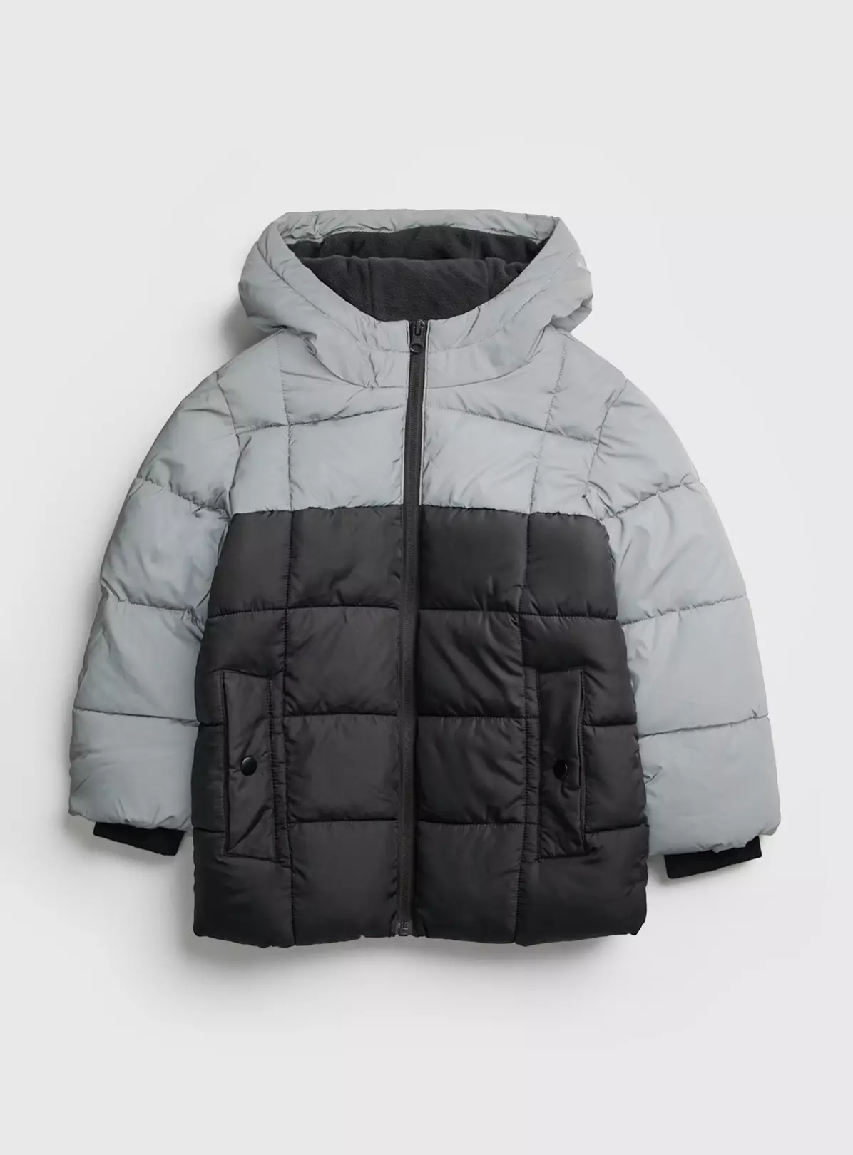 Your tiny trendsetter will look so grown up in this cool padded coat. With a stylish metallic grey hood and sleeves, it has zip fastening, poppered pockets and ribbed cuffs to lock in the warmth. Team with jeans or joggers to top off their look.