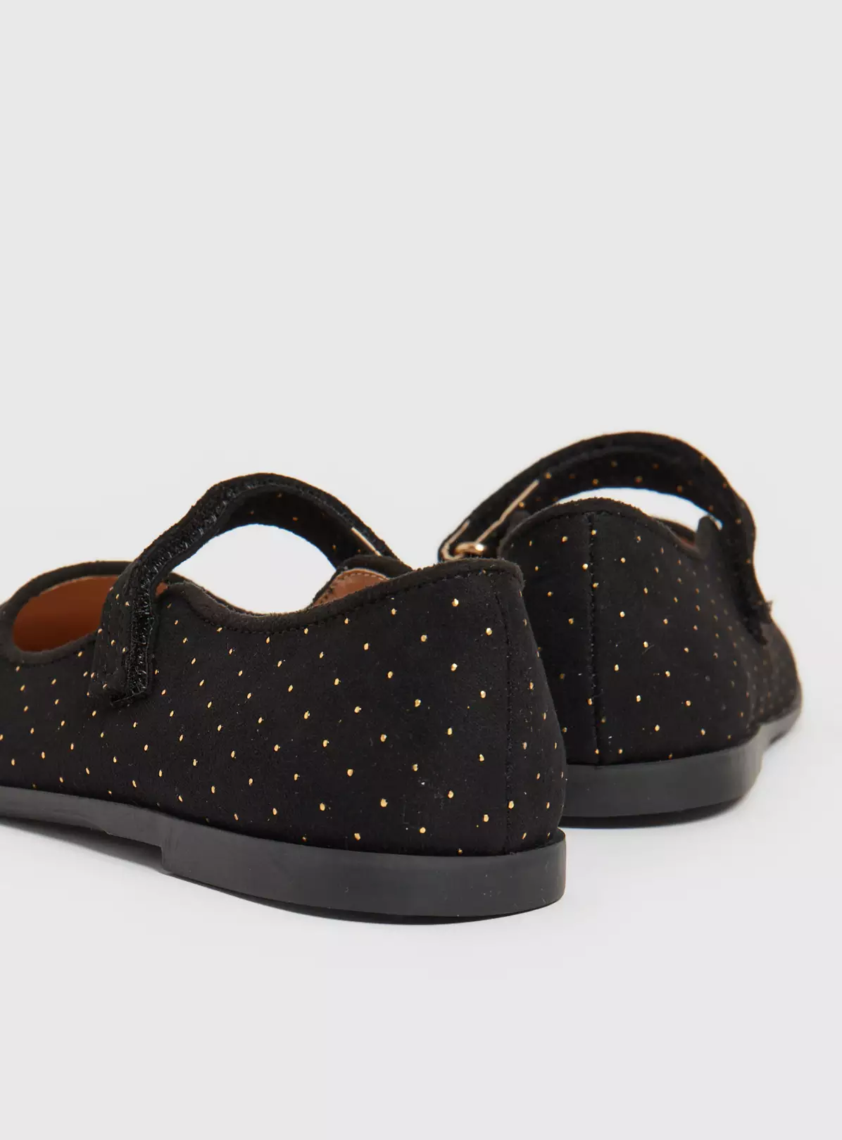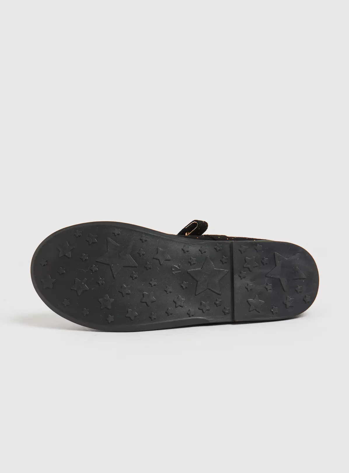 Our black velour bumper shoes are the perfect partner for their flippy hemmed dresses. With metallic gold dots and one touch fastening for a quick and easy fit, they’ll be throwing them on and off all summer long.