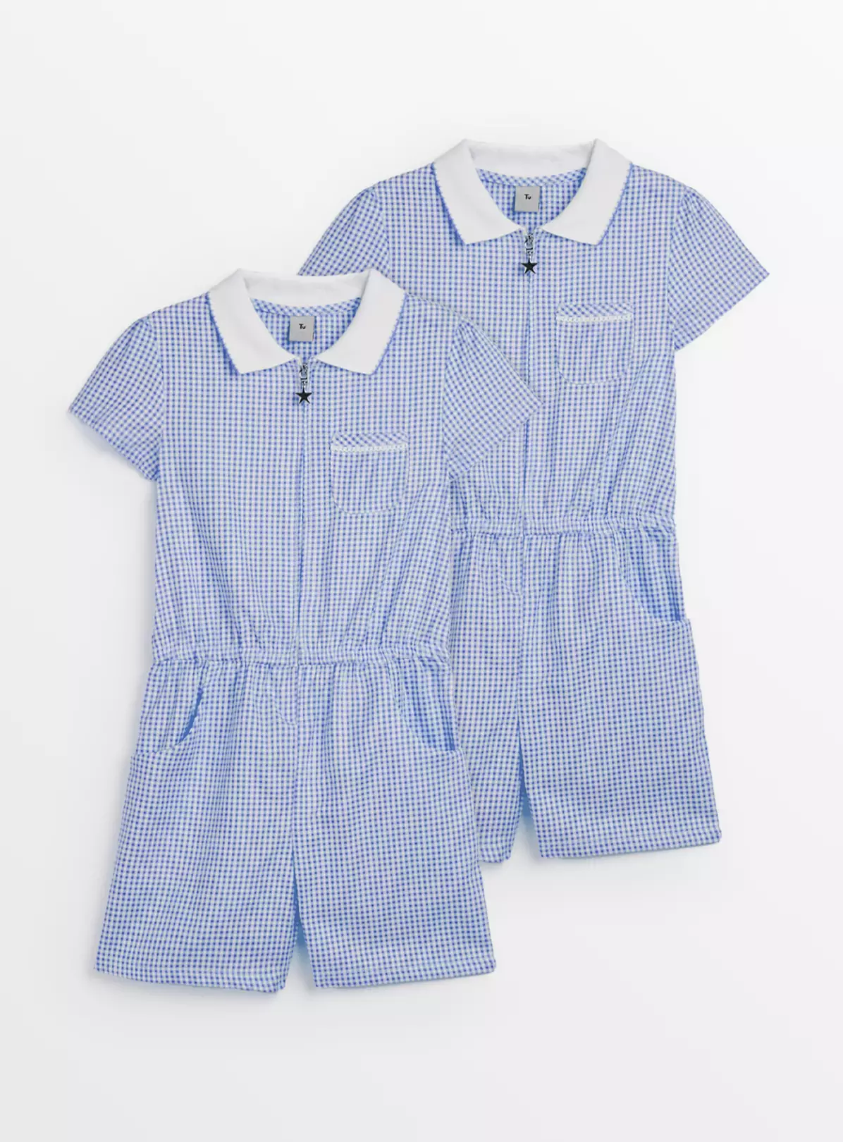 Get ahead for the summer term with our blue short sleeve gingham playsuit set. It comes with a zip front, side pockets and contrasting white ribbed collar. Perfectly practical, it’s made from a fabric which repels water-based stains, and is easy to iron. Presented in a handy double pack. See our full range of school uniform, especially designed to kit them out from head to toe this season.
