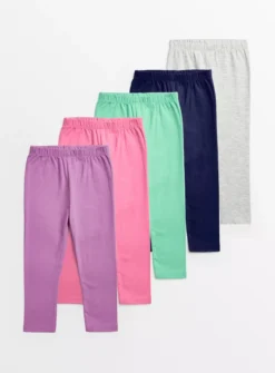 In a handy pack of 5, these cotton-rich leggings are an essential for everyday wear. Includes 1 pink, 1 turquoise, 1 purple, 1 navy blue and 1 grey pair with elasticated waists for maximum comfort. Perfect for pairing with their knitted jumpers and sweatshirts.