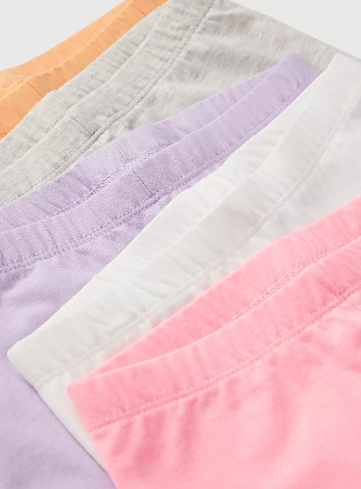 In a handy pack of 5, these cotton-rich leggings are an essential for everyday wear. Includes 1 pink, 1 white, 1 lilac, 1 grey and 1 orange pair with elasticated waists for maximum comfort. Perfect for pairing with their t-shirts and sweatshirts.