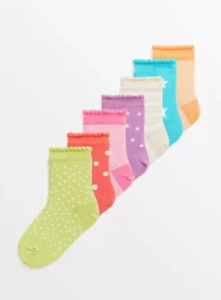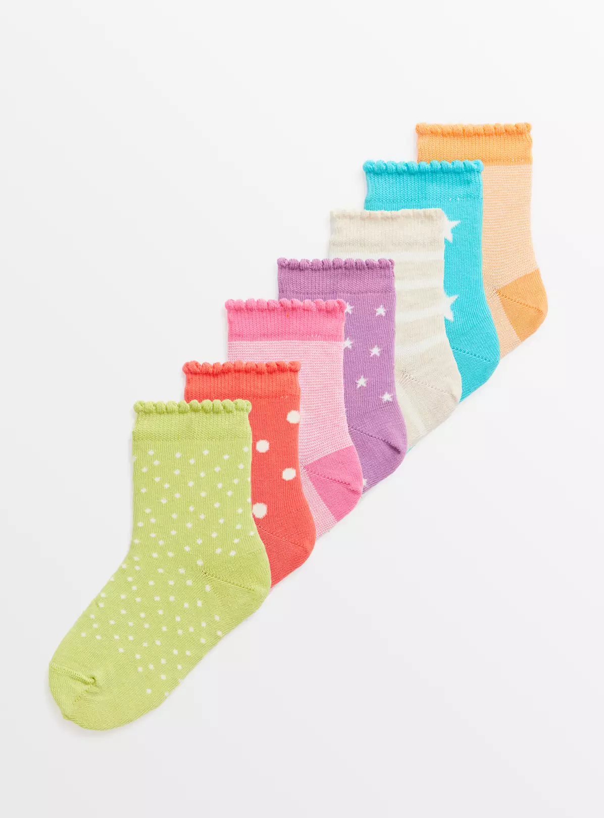 In a fun mix of bright colours, this handy seven pack of ankle socks come in lovely spot, star and stripe designs that your little one will love. They’re made from a comfy cotton rich blend, perfect for long, action packed days!