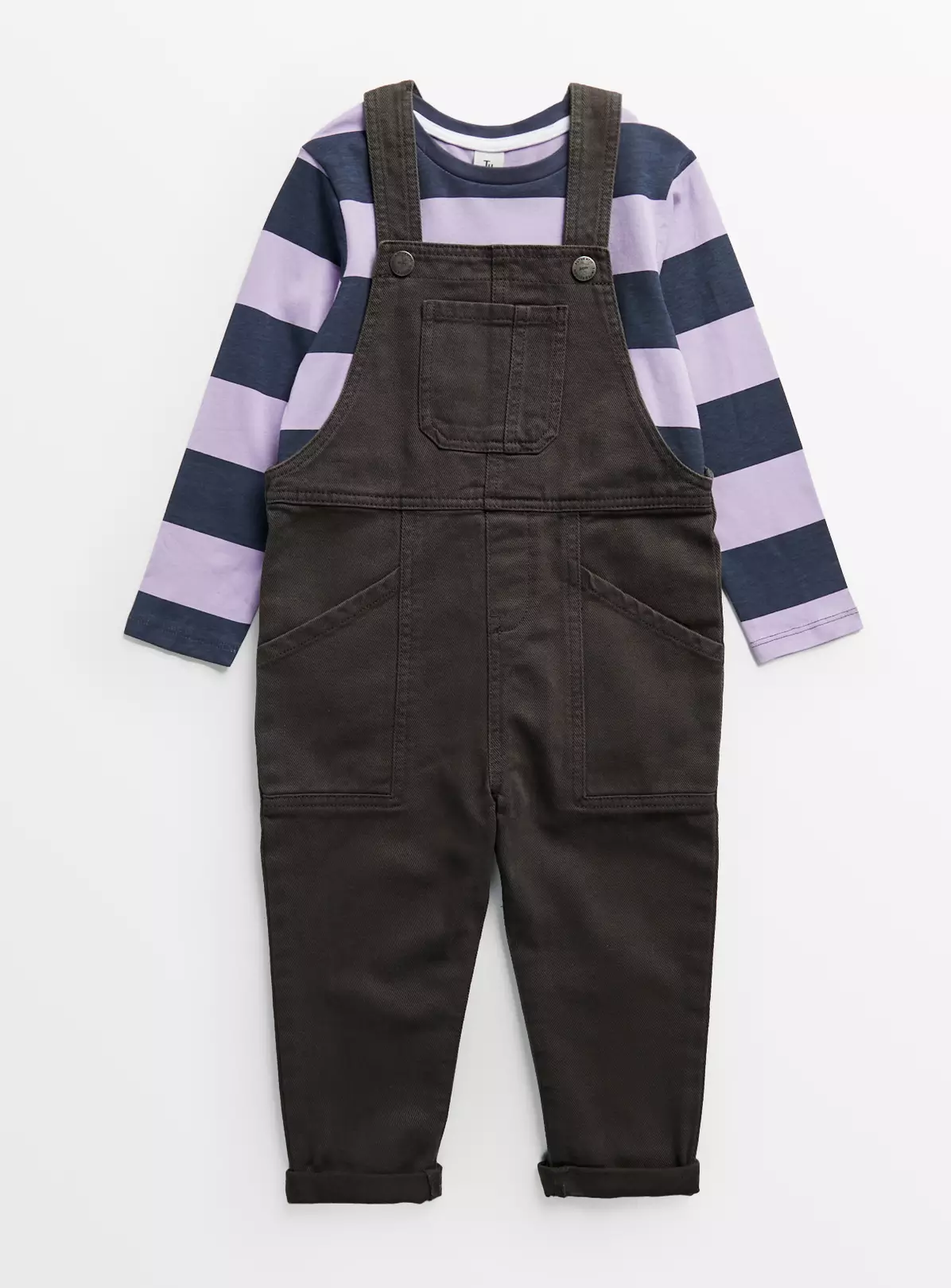 Get ahead for spring with this fab brown dungarees and t-shirt combo. Super cute, the dungs feature a cotton design with a little kangaroo pocket and the coordinating stripe tee has a crew neck and long sleeves.