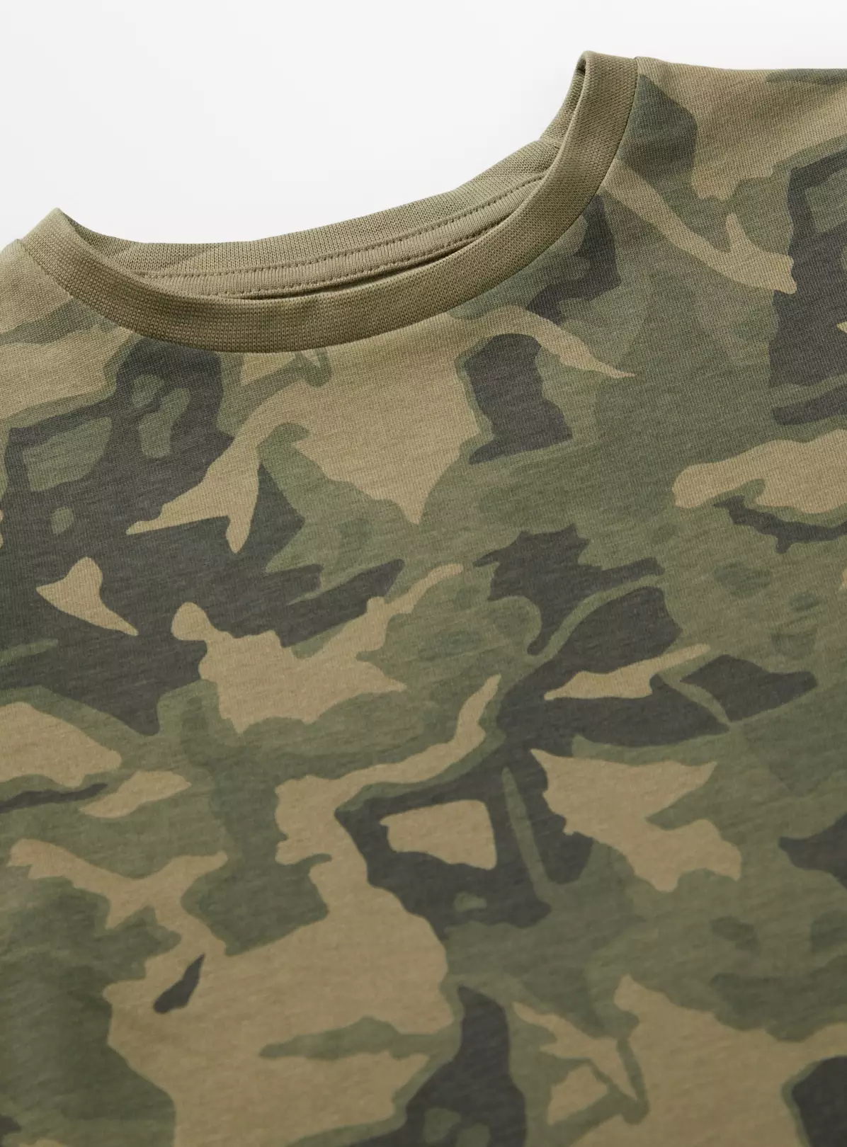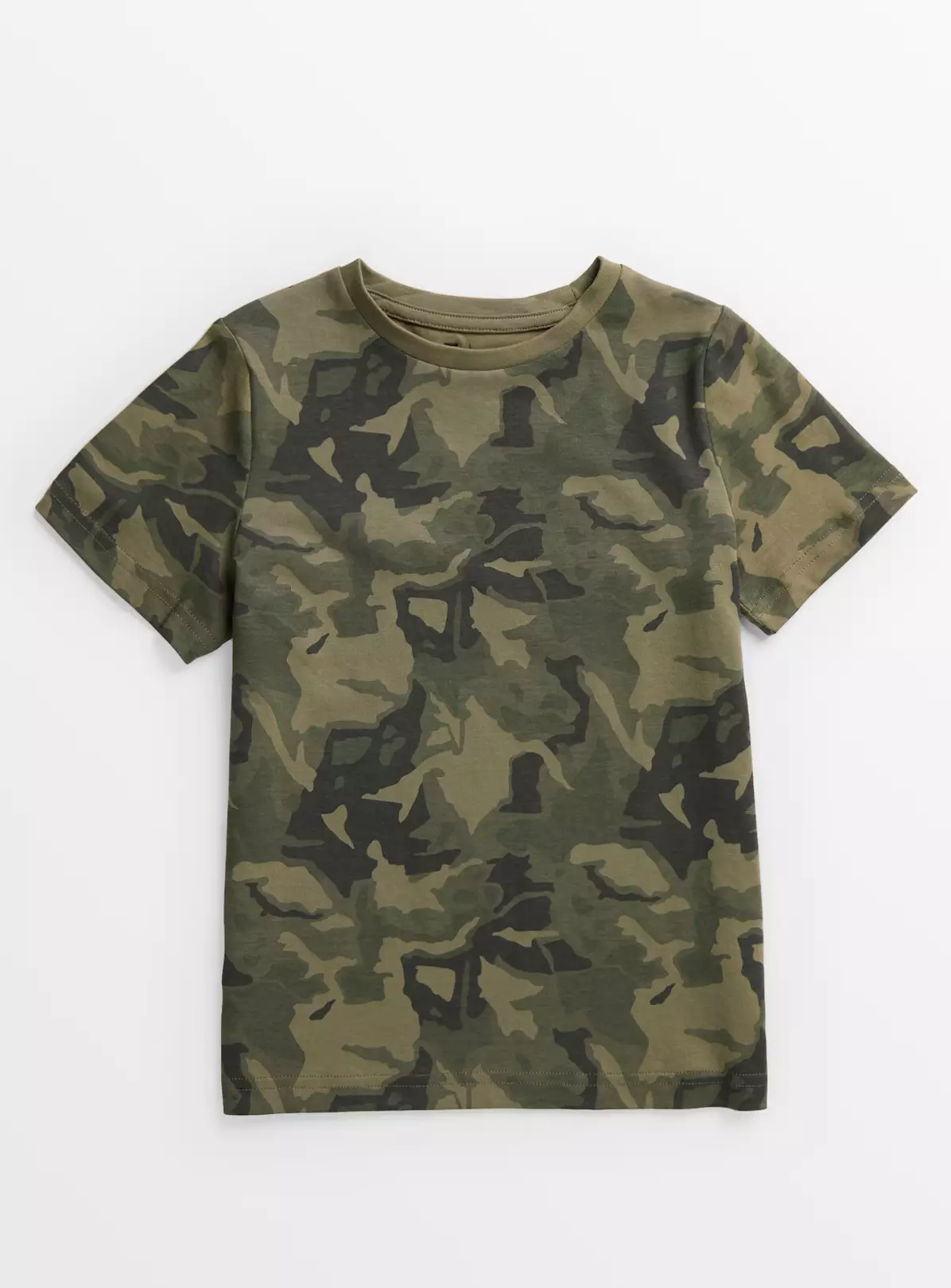 Your little one will look so cool in our new khaki tee. Made from pure cotton with a crew neck and short sleeves, it features a trendy camouflage print. Team with a pair of cargos to complete the outdoor look.