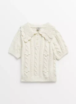 They’ll look a dream in our lovely cream knit. In a cable design, it has a pointelle detail collar, three values to the neck and short sleeves. Looks so pretty with their favourite skirt or shorts.