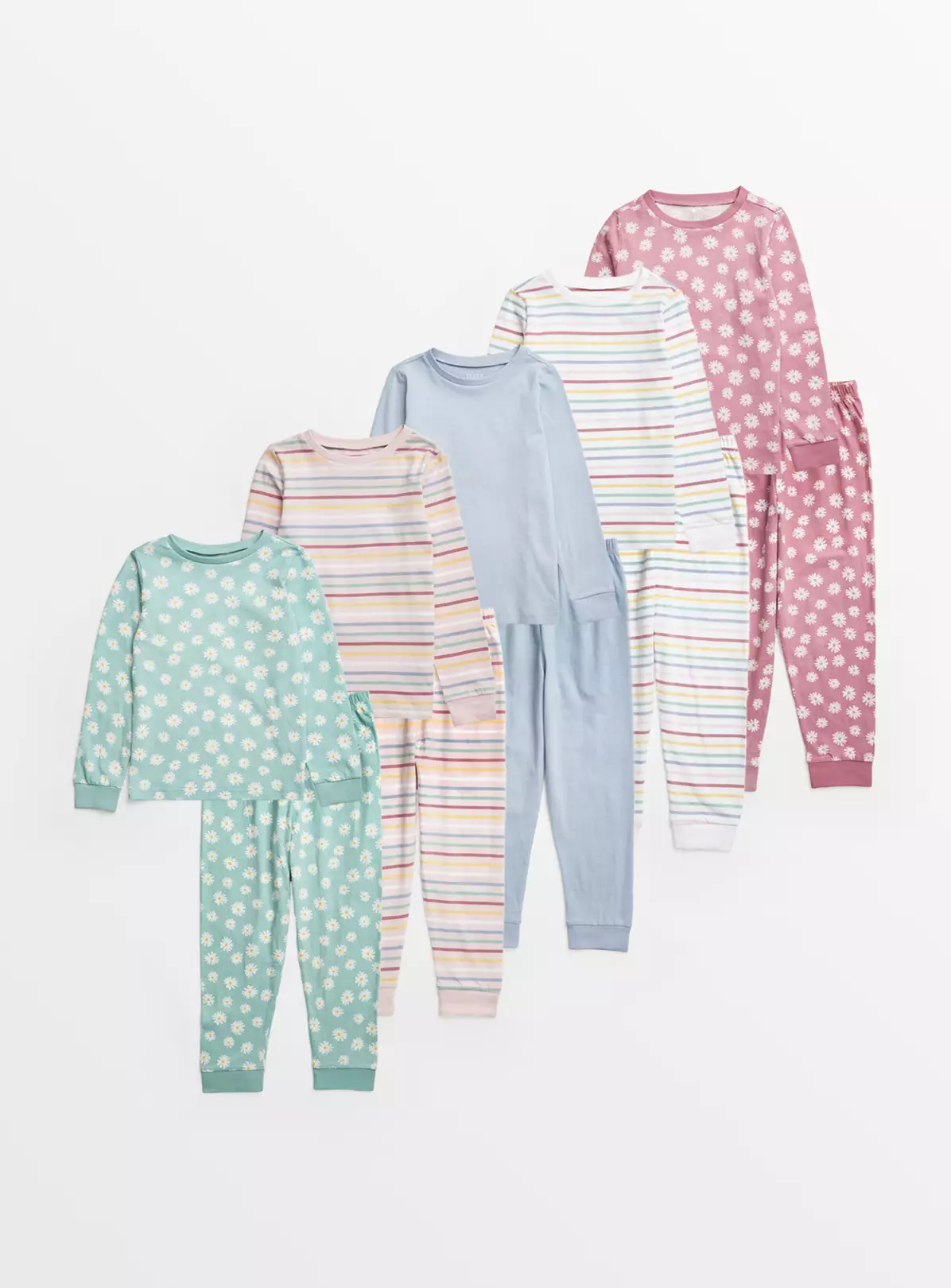 Kit out their nightwear drawer with this handy pack of 5 pyjama sets! This bundle includes 1 blue daisy print, 1 pink daisy print, 1 plain blue and 2 cream striped sets. Perfect for winter, they feature long sleeves and ribbed cuffs.