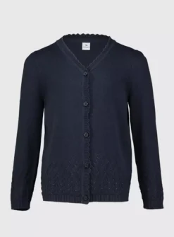 In a very dark navy shade, this pointelle knit cardigan is perfect for layering over their school polo or shirt next term. With flower shaped values, it’s made from pure cotton for a soft and comfortable feel, and even has a little name tag inside so they can write their name in!