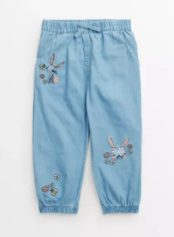 Our super cute denim jogger jeans are just what they need for spring. Made from pure cotton, they have an easy pull-on waist, elasticated cuffs and feature adorable bunny appliqués. They’ll love them!