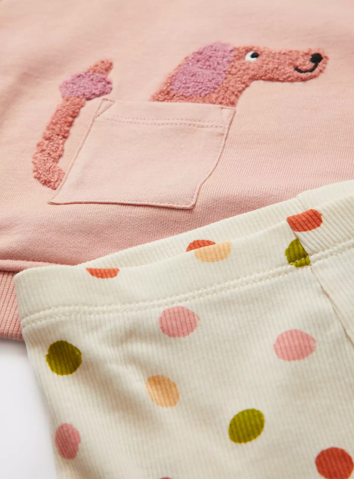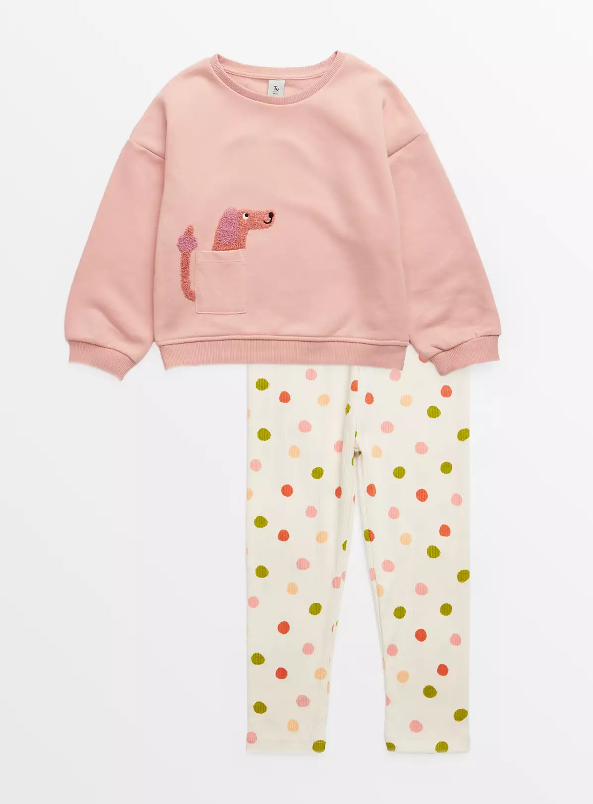 A cute and cosy addition to their wardrobe this season! Our sweatshirt and leggings set includes 1 pink sweatshirt which has a lovely little dog design on the front pocket, as well as 1 pair of cream ribbed leggings which feature an all-over polka dot print.