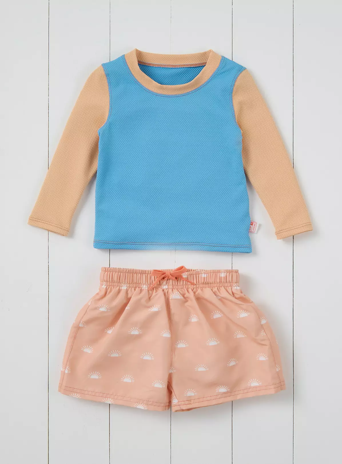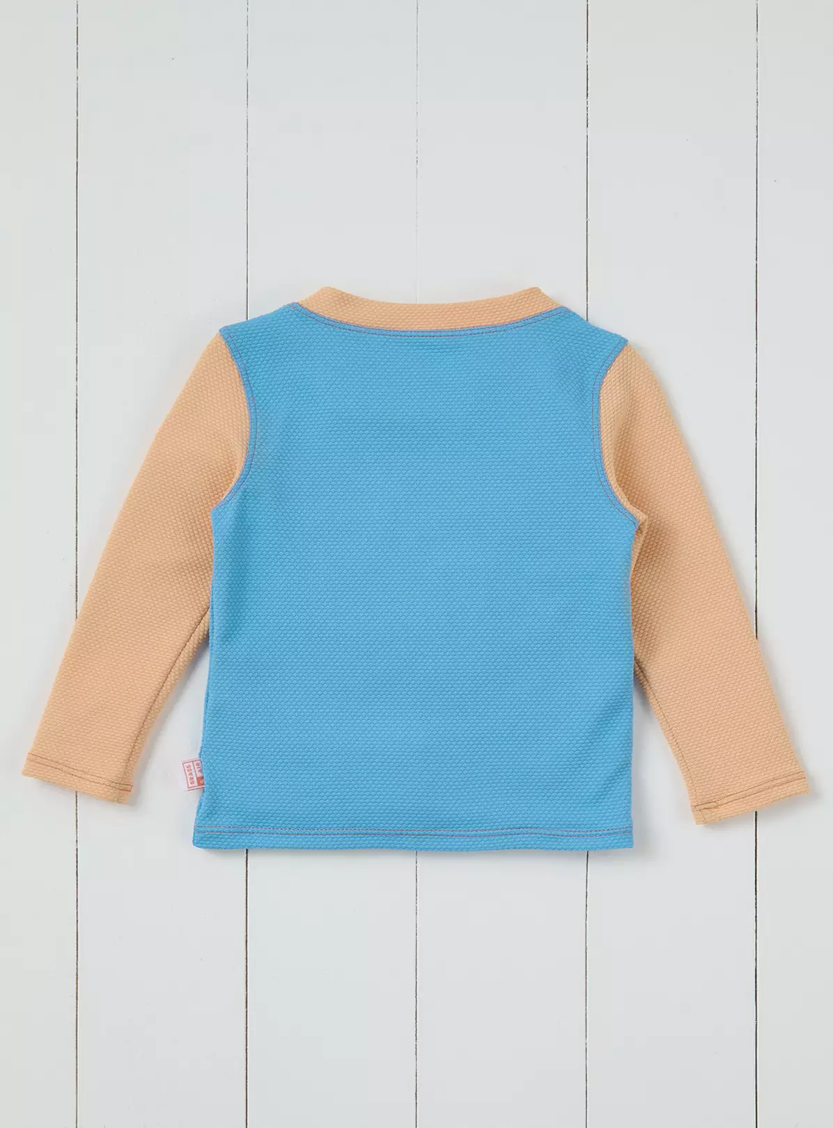 This long sleeve rash vest is great for the seaside. Colour-blocks of cornflower blue and pastel peach make these colour pairings feel intensely harmonious. The rash vest is perfect for the pool and the beach as well as doubling up as a t-shirt. Our new waffle knitted fabric is super soft and kind to the skin. The fabric includes UPF50+ for extra protection from the sun. It is also eco-friendly as it is made using recycled materials. Our long sleeve rash vests have been made especially for toddlers and children. Pair these with our swim shorts and kids bucket hat for a light, pastel outfit.