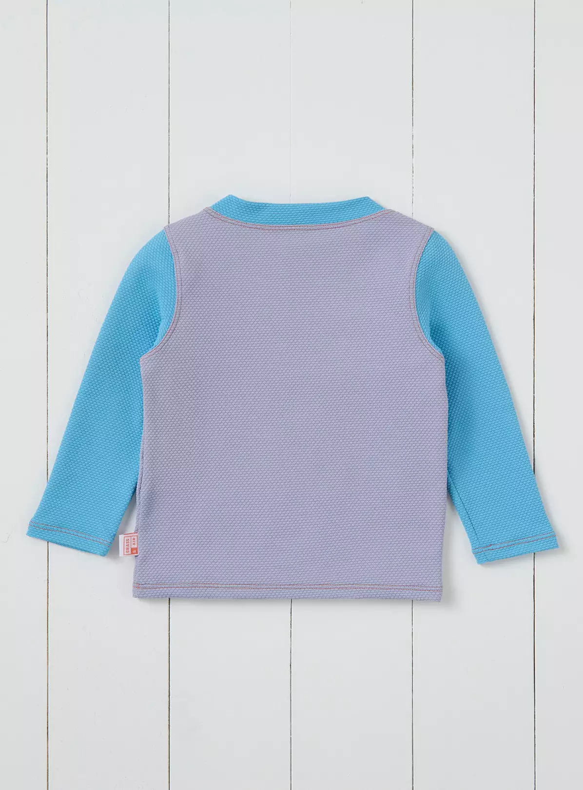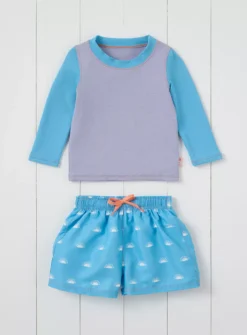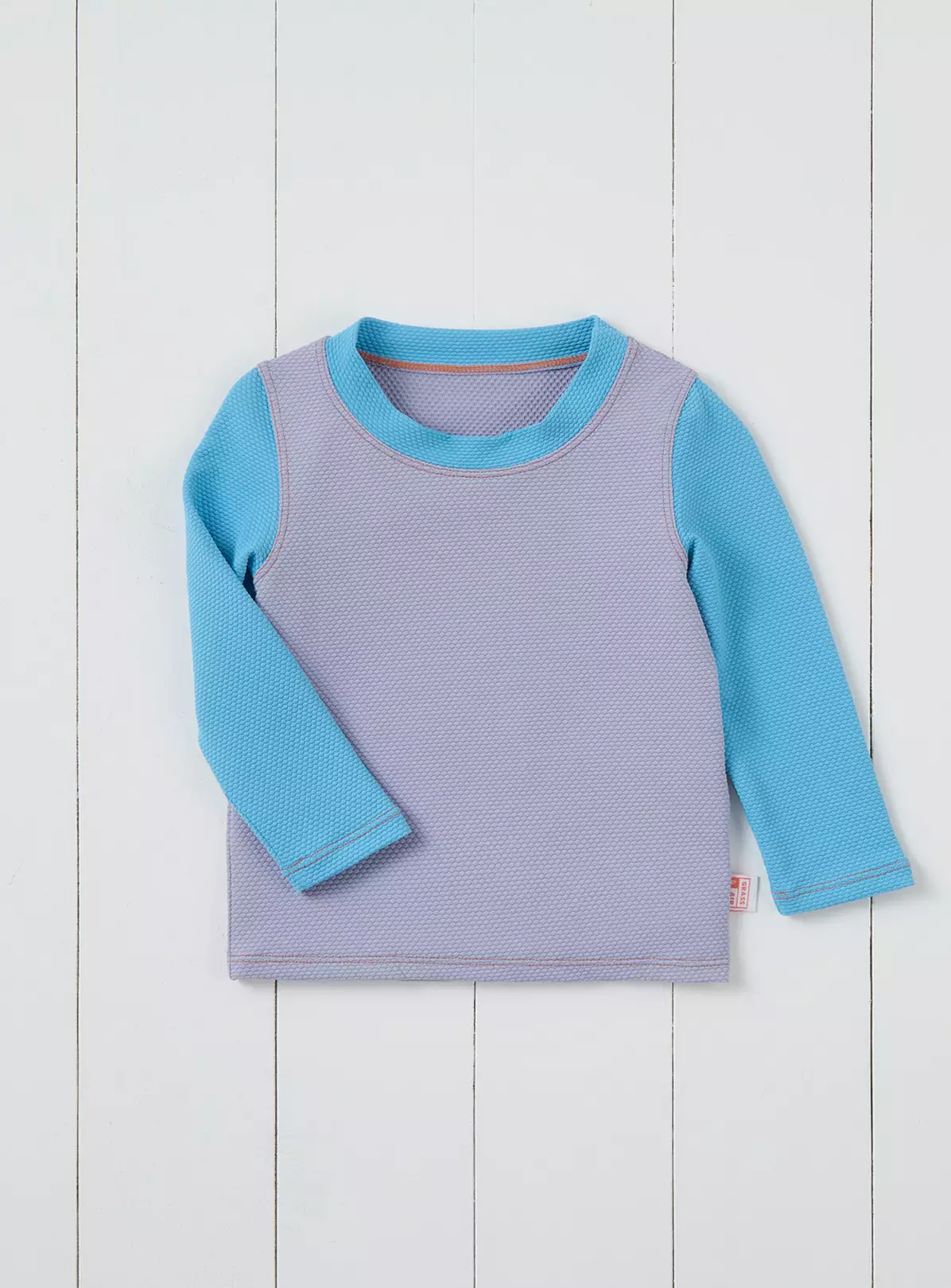 This long sleeve rash vest is great for the seaside. Lavender is paired with our whimsical blue to create two intensely harmonious shades. The rash vest is perfect for the pool and the beach as well as doubling up as a t-shirt. Our new waffle knitted fabric is super soft and kind to the skin. The fabric includes UPF50+ for extra protection from the sun. It is also eco-friendly as it is made using recycled materials. Our long sleeve rash vests have been made especially for toddlers and children. Pair these with our swim shorts and kids bucket hat for a light and refreshing outfit.
