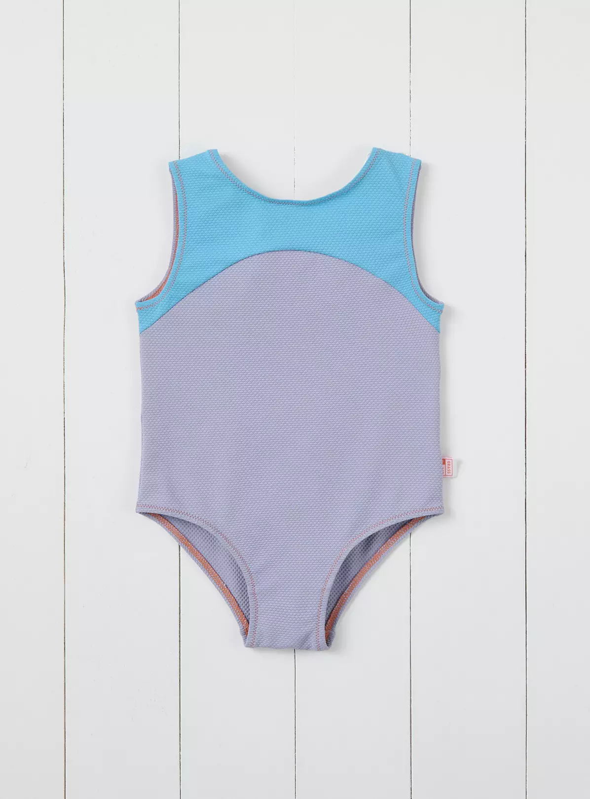 This lavender swimsuit brings a sense of classic nostalgia to summer play. Lavender is a lovely lilac shade, that is both unexpected and versatile.This classic swimming costume comes in a soft waffle fabric with a honeycomb texture. The fabric is made from recycled polyester to give our swimsuits an extra stretch. Available in a range of sizes for both babies and kids. It is perfectly paired with the matching cornflower swim shorts and lavender colour-changing sandals.