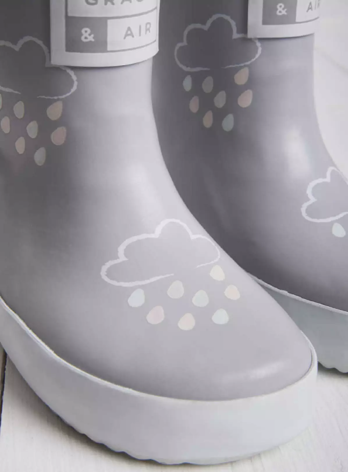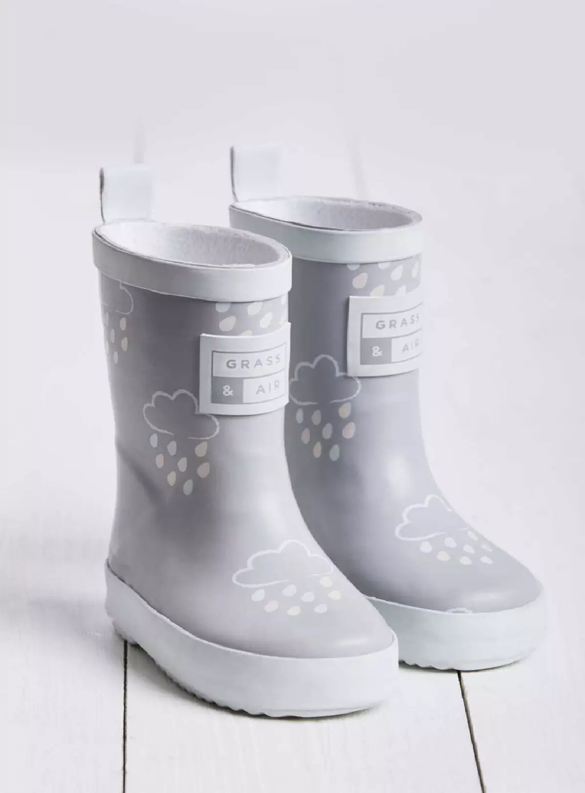 Baby Grey. Never knowingly underdressed. Marauding through parks, puddles and urban playgrounds near you, this collection of chalky grey, pink and blue colour-reveal wellies offers the tiniest of adventurers a chance to go wild outside with sizing starting at infant size