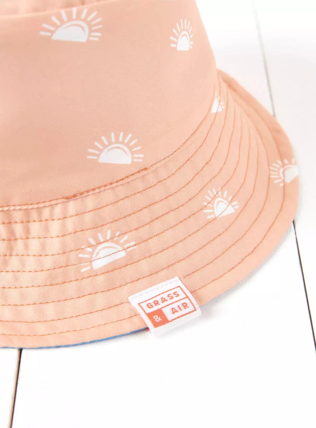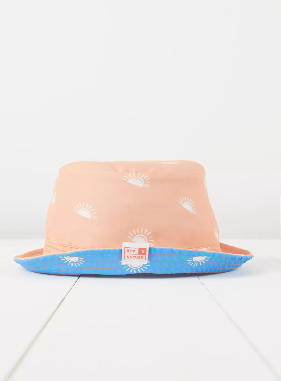 New to Grass & Air, our swim bucket hat is perfect for the beach and when you’re out exploring. In a bold peach that reminds us of summer sunsets, this hat included our classic sun print design. The bucket hat can be worn two ways with a cheerful shade of cornflower blue on the underside. Our bucket hats are available in sizes small (1-2 years), medium (3-4 years), and large (5-6 years). They match perfectly with our new Sun+Swim range featuring harmonious pastel shades.