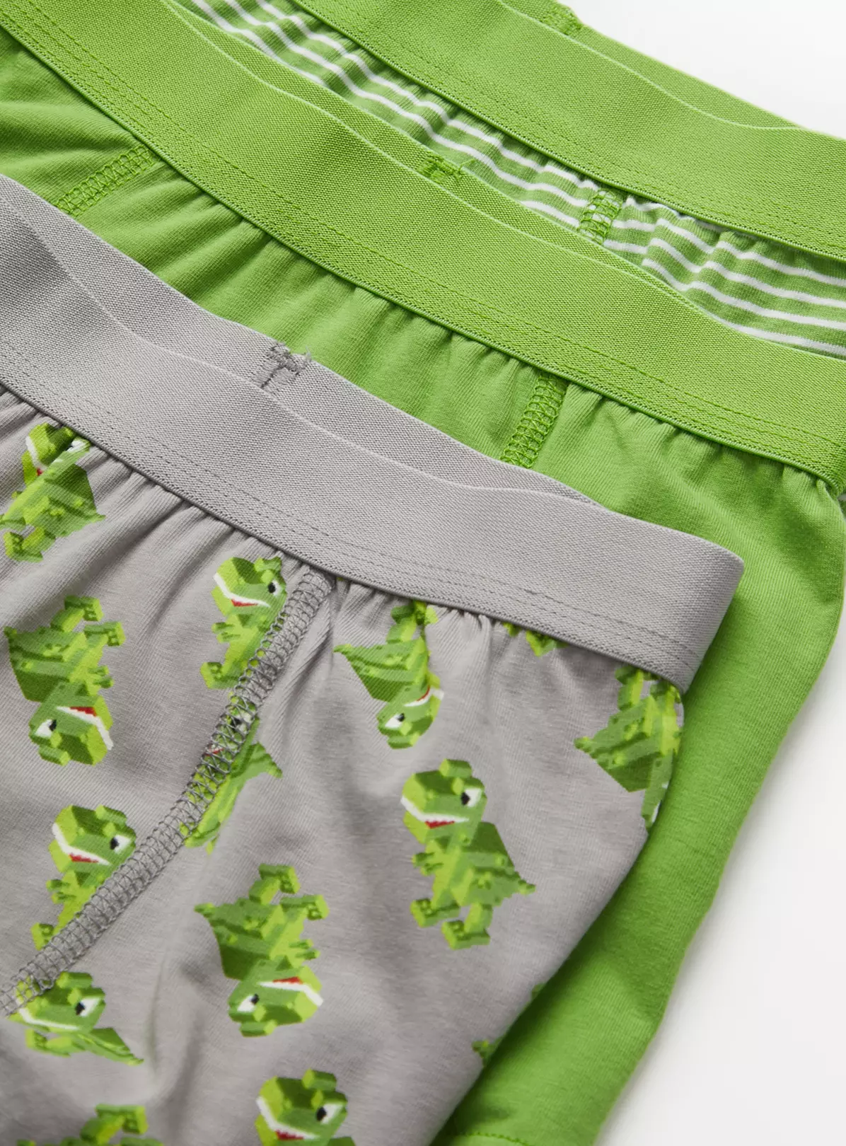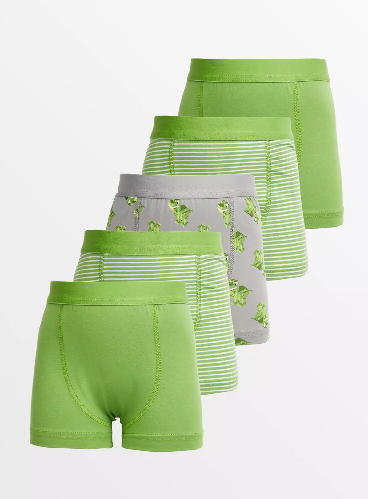 Crafted from cotton with added stretch, our 5 pack of green trunks adds a cool dinosaur vibe to their underwear collection! Includes 2 green, 2 green stripe and 1 grey pair which has a cool pixel dinosaur print!