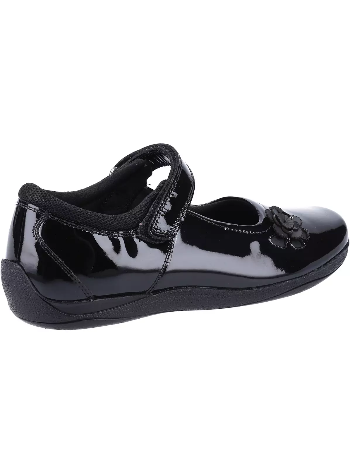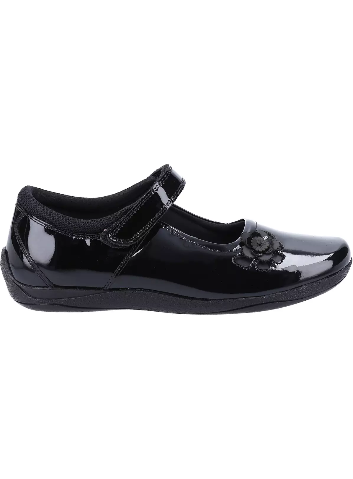 Classic Girls Back To School Shoe; The Jessica is elegance at its finest. A simple touch fastening strap finished with an enhanced heel guard for scuff protection and finished off with a decorative flower and patent finish.