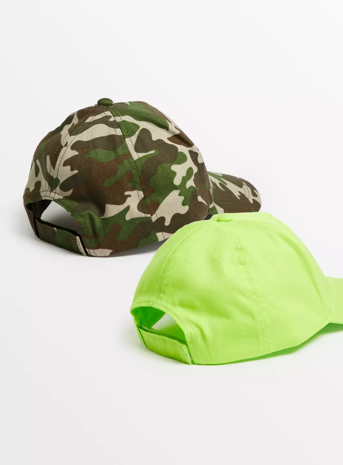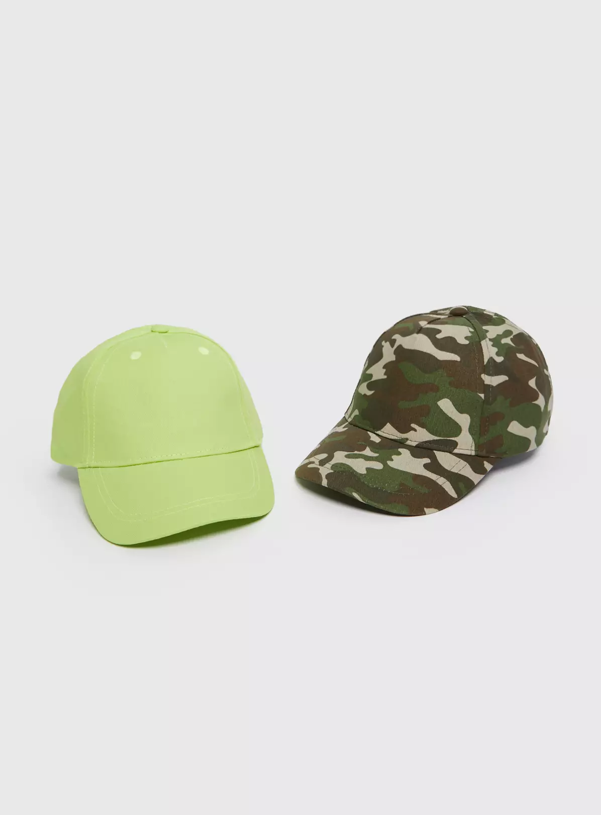 Our set of 2 hats are perfect for the summer heat. This pack includes 1 khaki camo print cap and 1 green cap! They’re a must-have for their little summer collection!