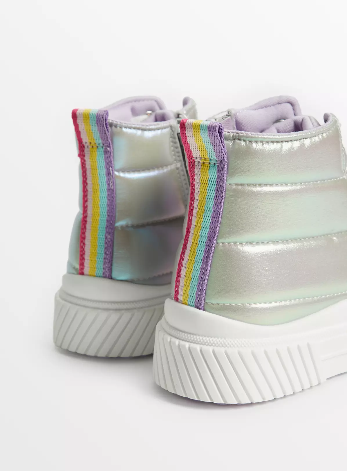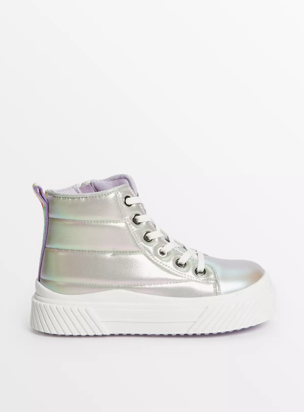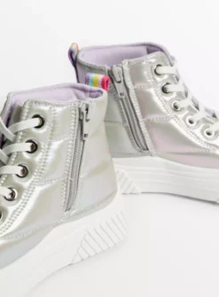 Our lilac iridescent trainers are a super fun and super glam addition to their shoe collection! They come in a high top style and have a quilted design. With lace up fastening, they also have a cool chunky sole. What’s not to love?