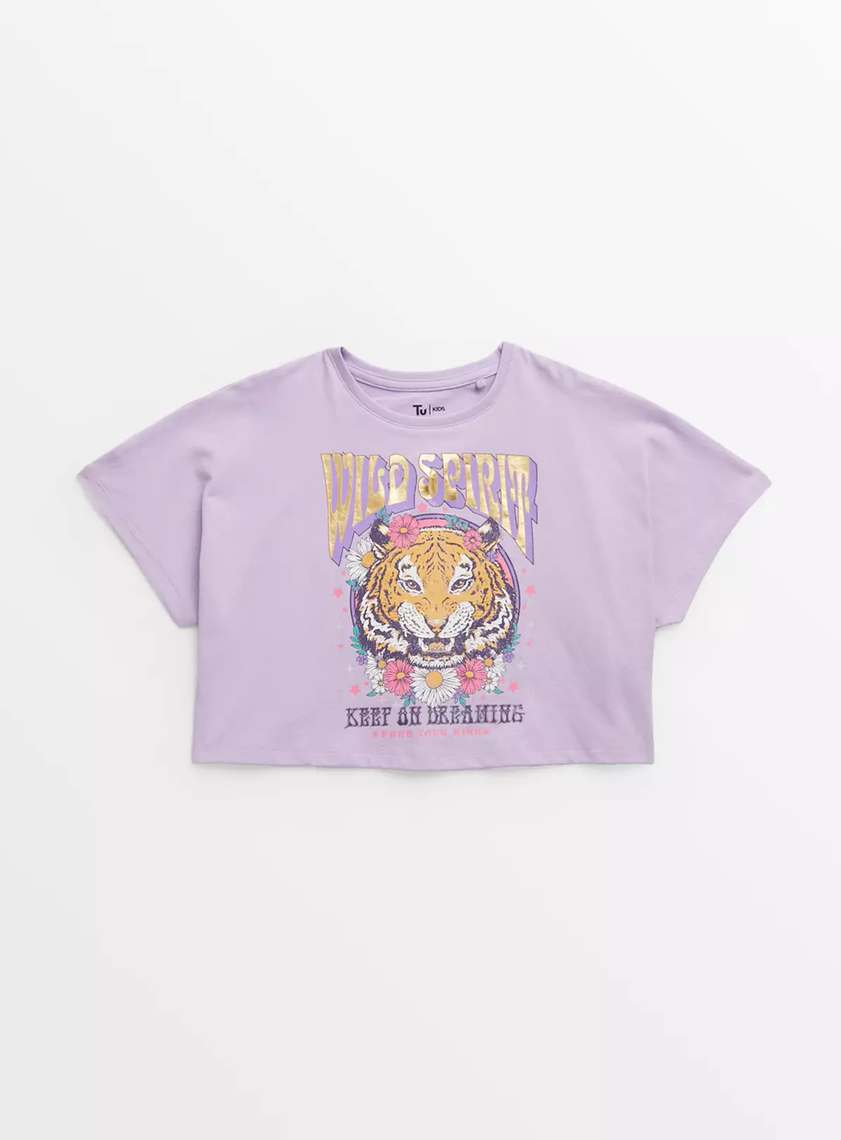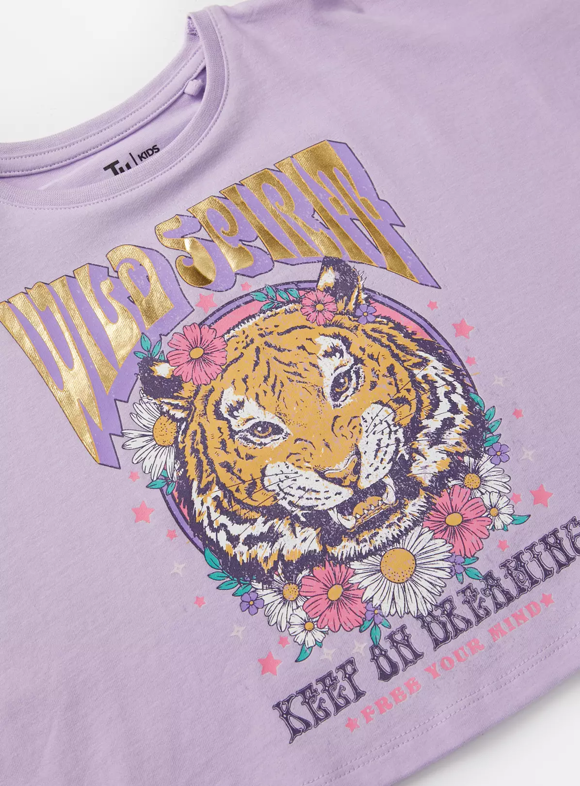 Super stylish, your little one will love our lilac cropped t-shirt! It features a cool tiger print on the front alongside a ‘Wild Spirit’ slogan. Pair it with their leggings for a fun weekend outfit.