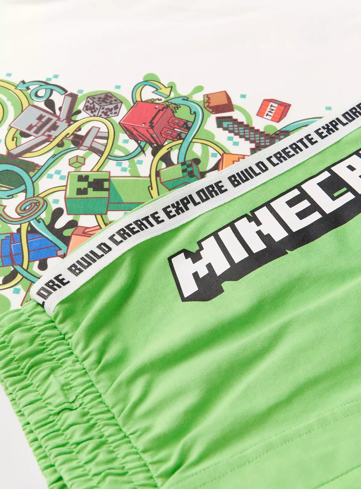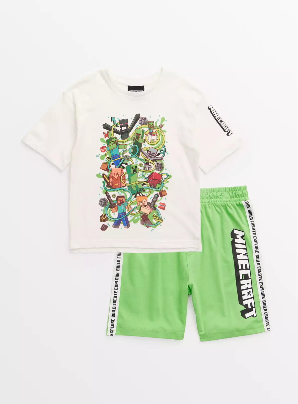 A must-have for gamers! Our Minecraft themed pyjama set includes 1 white short sleeve t-shirt with a character graphic print on the front, as well as 1 pair of green pyjama shorts to match!