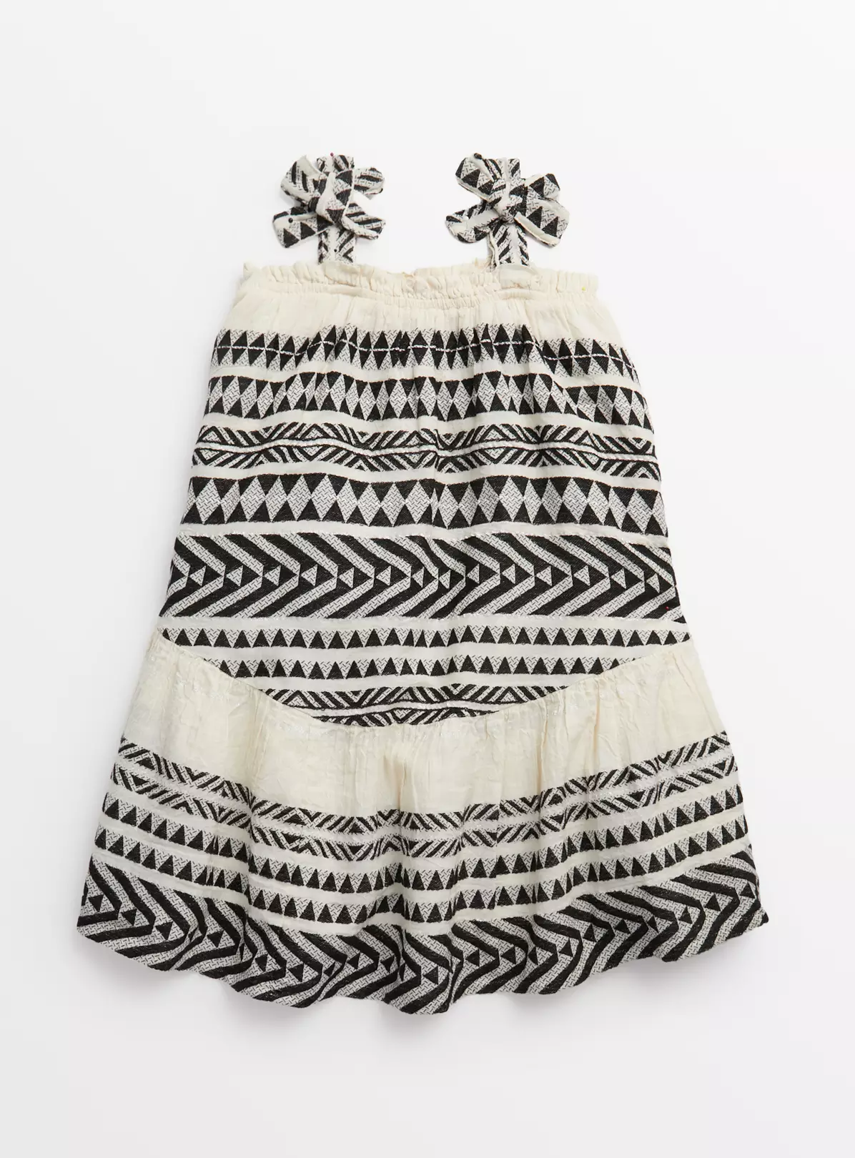 Perfect for their summer holidays and trips spent out and about, our woven dress comes in a monochrome aztec print. It features an elasticated neckline with tie straps, designed for comfy all-day wear!