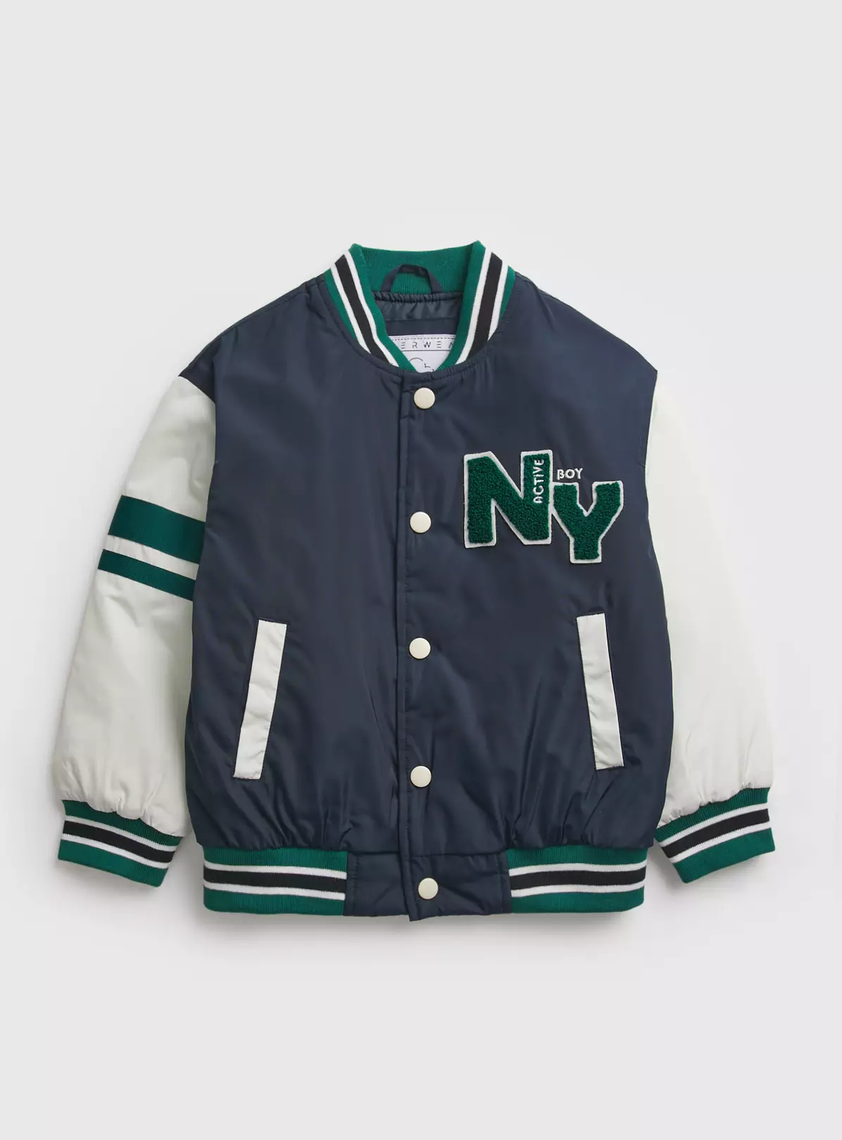 Boost their mini wardrobe with this Varsity inspired navy basebell jacket. Designed with appliqué details, colourblock styling and handy side pockets, it has a stretchy stripe ribbed neck, cuffs and hem for comfort. They will love wearing this trendy number! It’s shower resistant too, for extra bonus points with mum.
