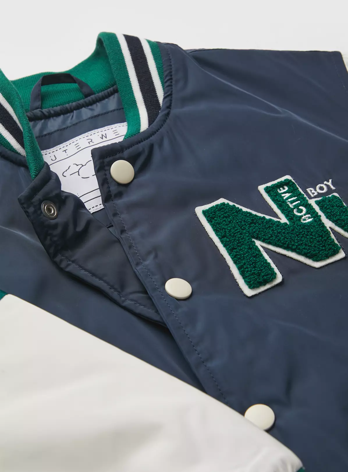 Boost their mini wardrobe with this Varsity inspired navy basebell jacket. Designed with appliqué details, colourblock styling and handy side pockets, it has a stretchy stripe ribbed neck, cuffs and hem for comfort. They will love wearing this trendy number! It’s shower resistant too, for extra bonus points with mum.