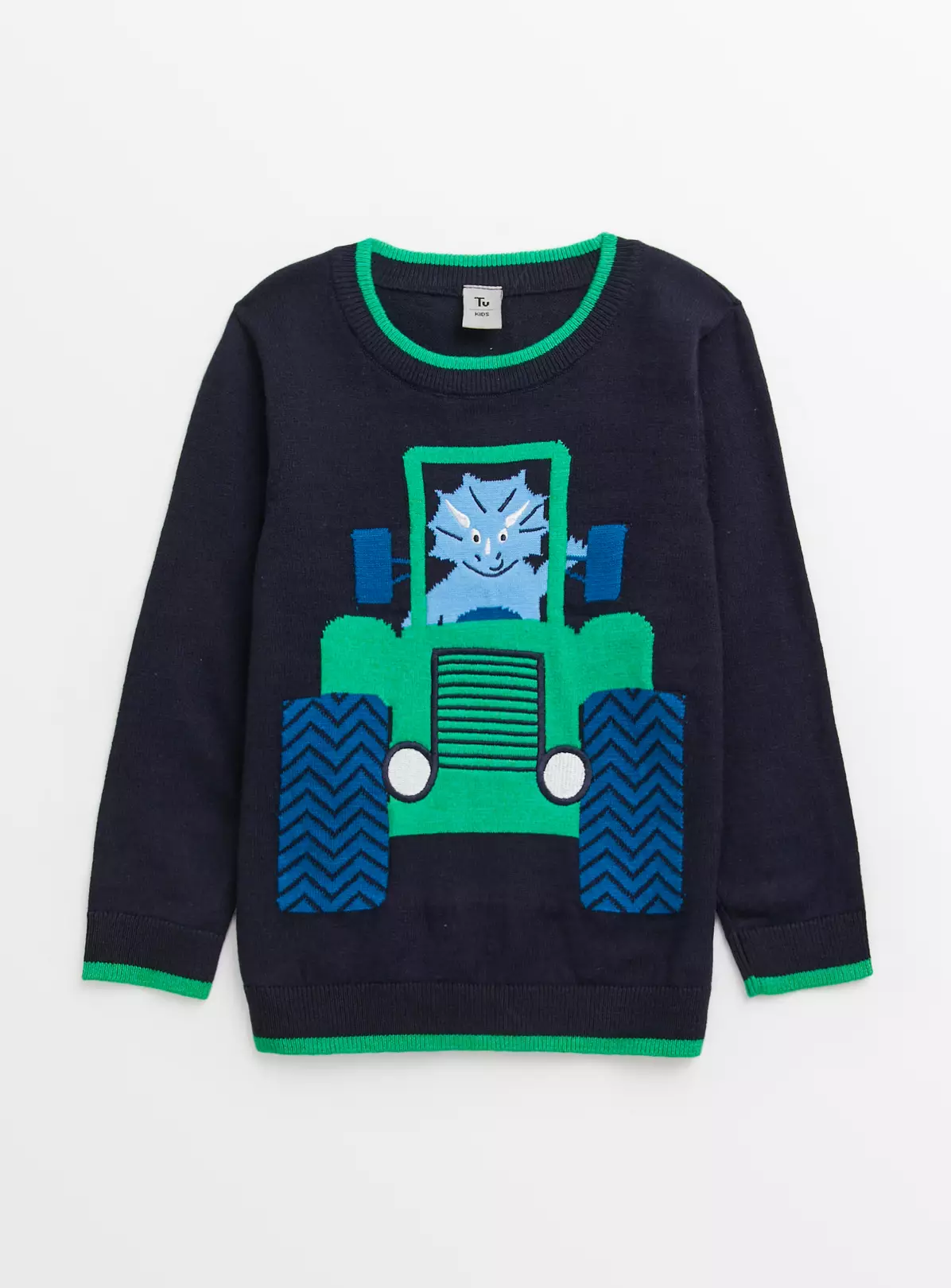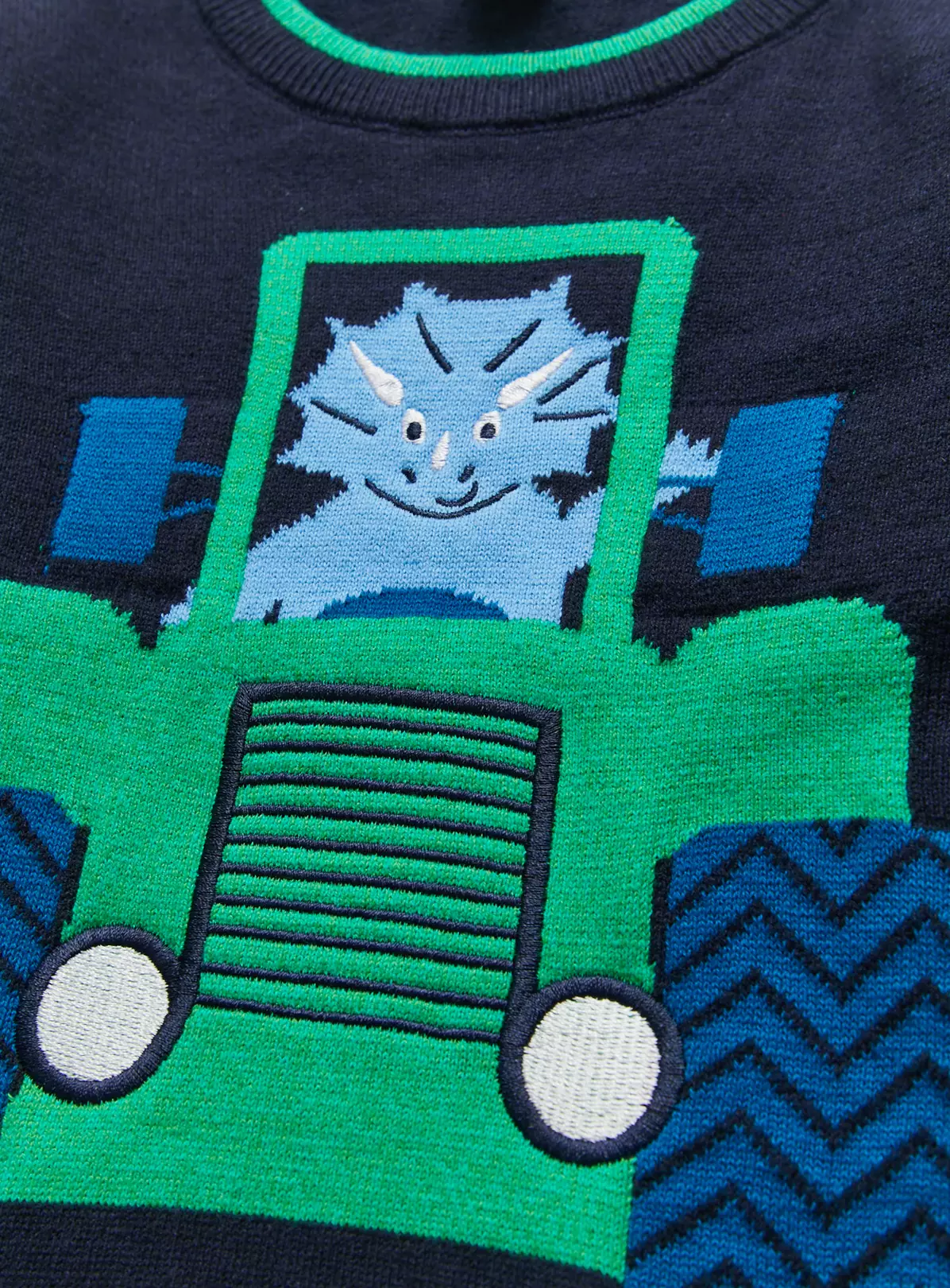 Our super fun jumper comes in a navy with contrasting green trims. It features a cool dinosaur and tractor design on the front which your little one will love! Team it with cargo trousers for the ultimate look.