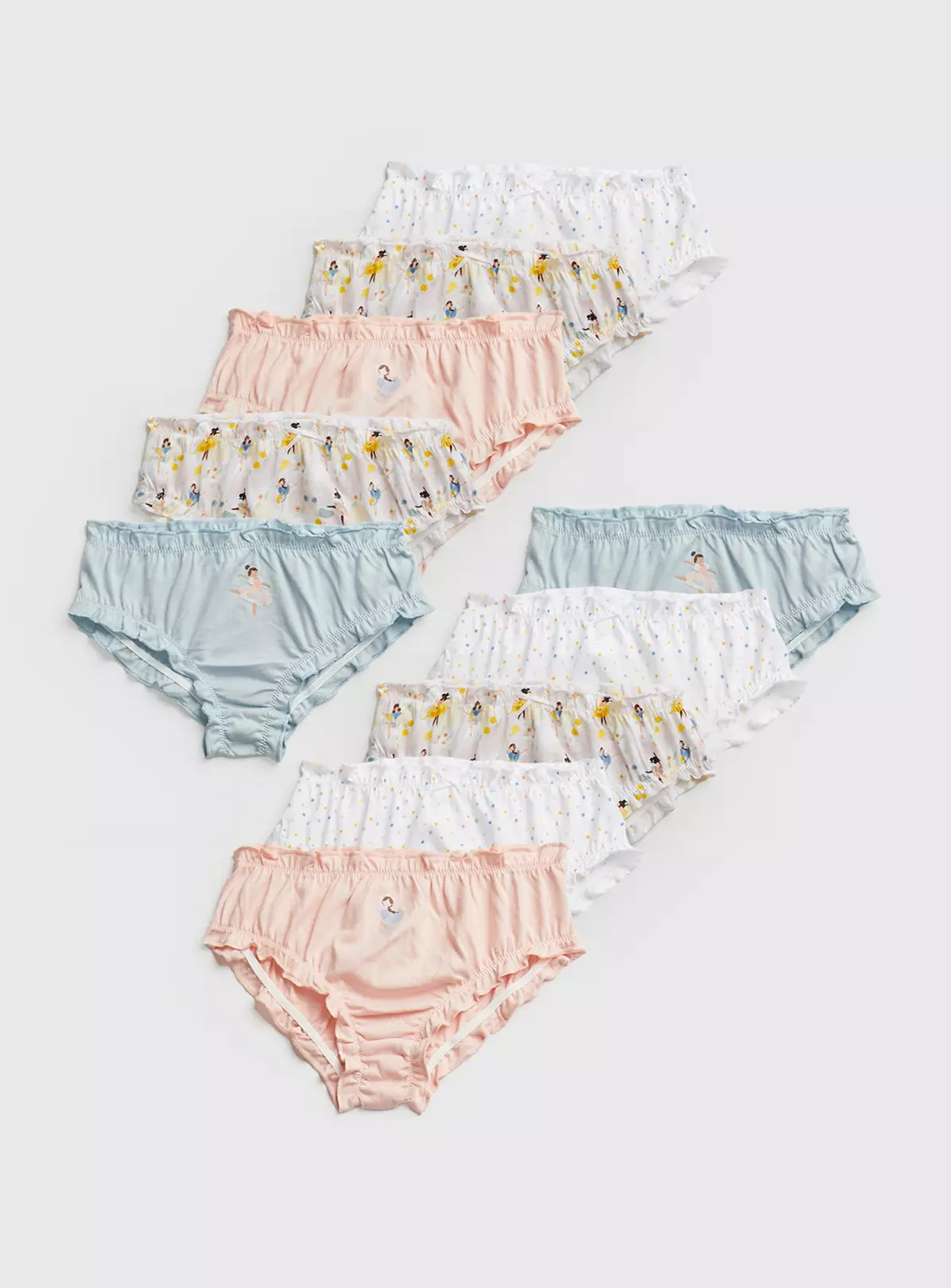 Perfect for adding a pop of colour to your little one’s essentials drawer, this ten pack of briefs lets you stock up in style. Made from pure cotton, you get super cute ballerina and spotty designs in assorted pastel shades.