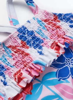 On the lookout for some pretty swimwear for your little one this summer? This lovely swimsuit comes in a bright floral design and has adorable smocking to the front with a frill. Just add sunshine, sea and sunnies!