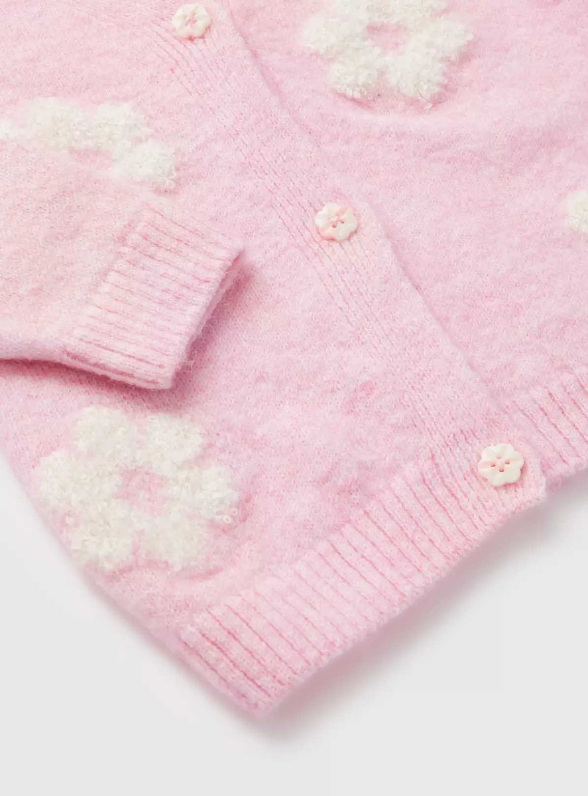 Stock up on cute knits for their spring wardrobe with our lovely flower spangled cardigan. In a soft baby pink, it has flower value fastening and looks fab with their summer leggings.