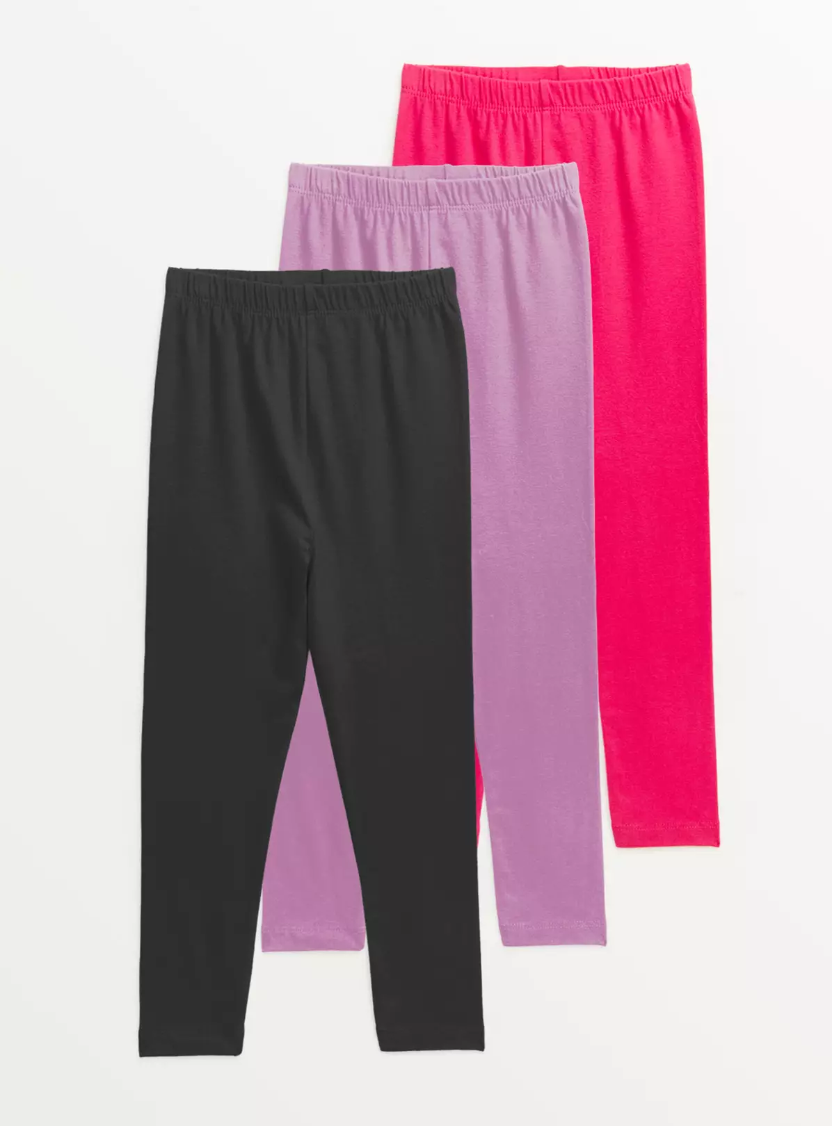 In a handy pack of 3, these cotton rich leggings are an essential for everyday wear. Includes 1 pink, 1 lilac and 1 black pair, with elasticated waists for maximum comfort. Perfect for pairing with their knitted jumpers and sweatshirts.