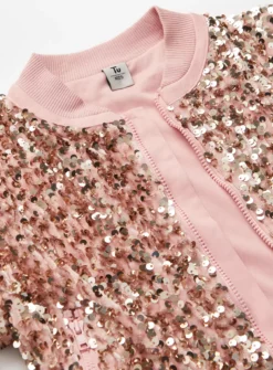 Add some sparkle to their party wear with our fabulous pink sequin jacket. in a cool bomber style, it has a handy zip-through front, zip pockets and ribbed trims. So cool! They’ll love it!