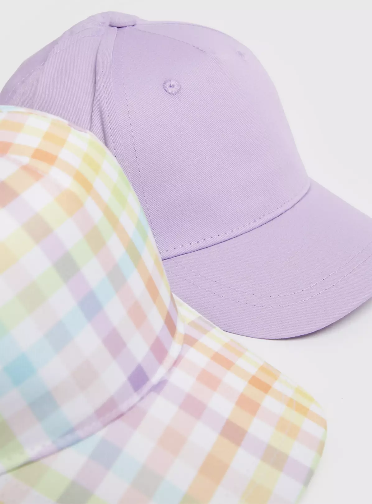Our set of 2 hats are perfect for the summer heat. This pack includes 1 lilac cap and 1 rainbow coloured cap in a cool check design! They’re a must-have for their little summer collection!