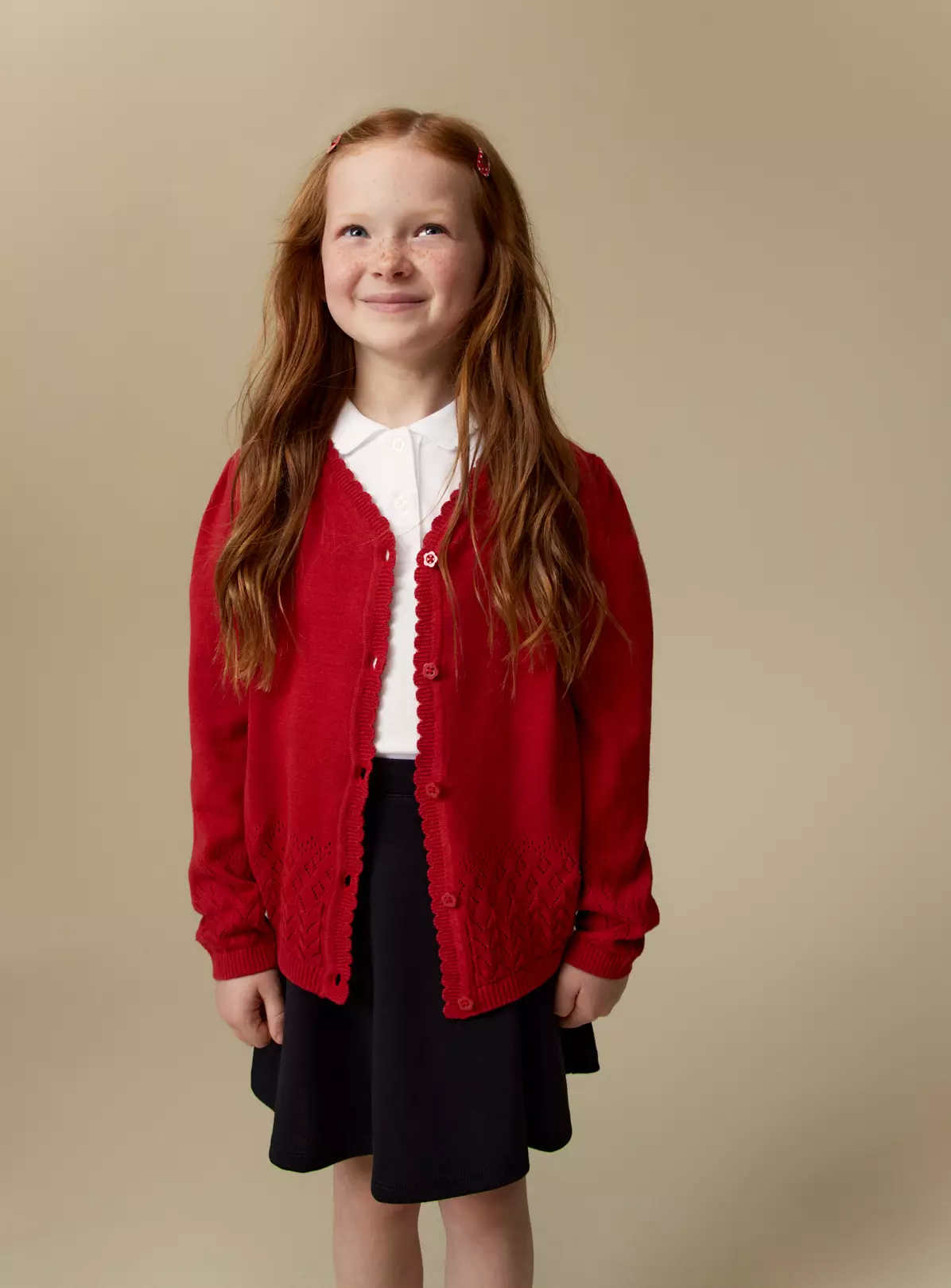 Has another cardi gone into the black hole again? Get them back on track with this red pointelle knit cardigan. With flower shaped values and ribbed trims, it’s made from pure cotton for a soft and comfortable feel, and has a little name tag inside to help stop them losing it again!