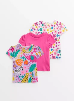In a handy pack of 3, our short sleeve t-shirts are bold and beautiful in white floral, lilac safari animal and plain pink. Team with the matching leggings for the full on ensemble.