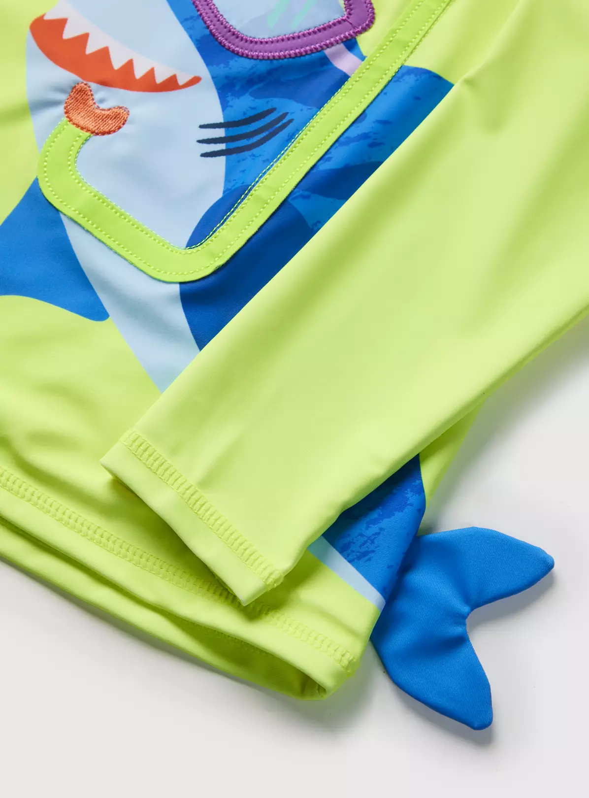 Our super fun rash vest and shorts set features a fantastic colourful snorkelling shark graphic on the top and a sea creature print on the shorts. Perfect for giving your little one added protection from the sun on the beach or around the pool.