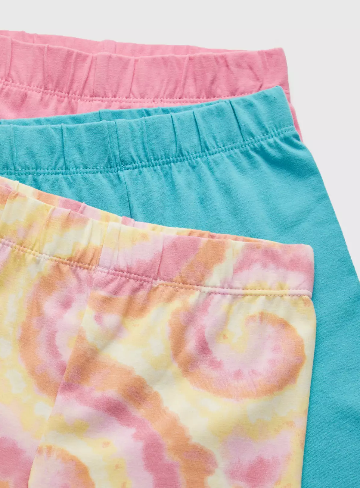 In a handy pack of 3, our cycling shorts are super stylish and super comfy! Crafted from a cotton-rich blend, they have elasticated waists for a snuggly fit. This set includes 1 pink tie dye, 1 turquoise and 1 pink pair.