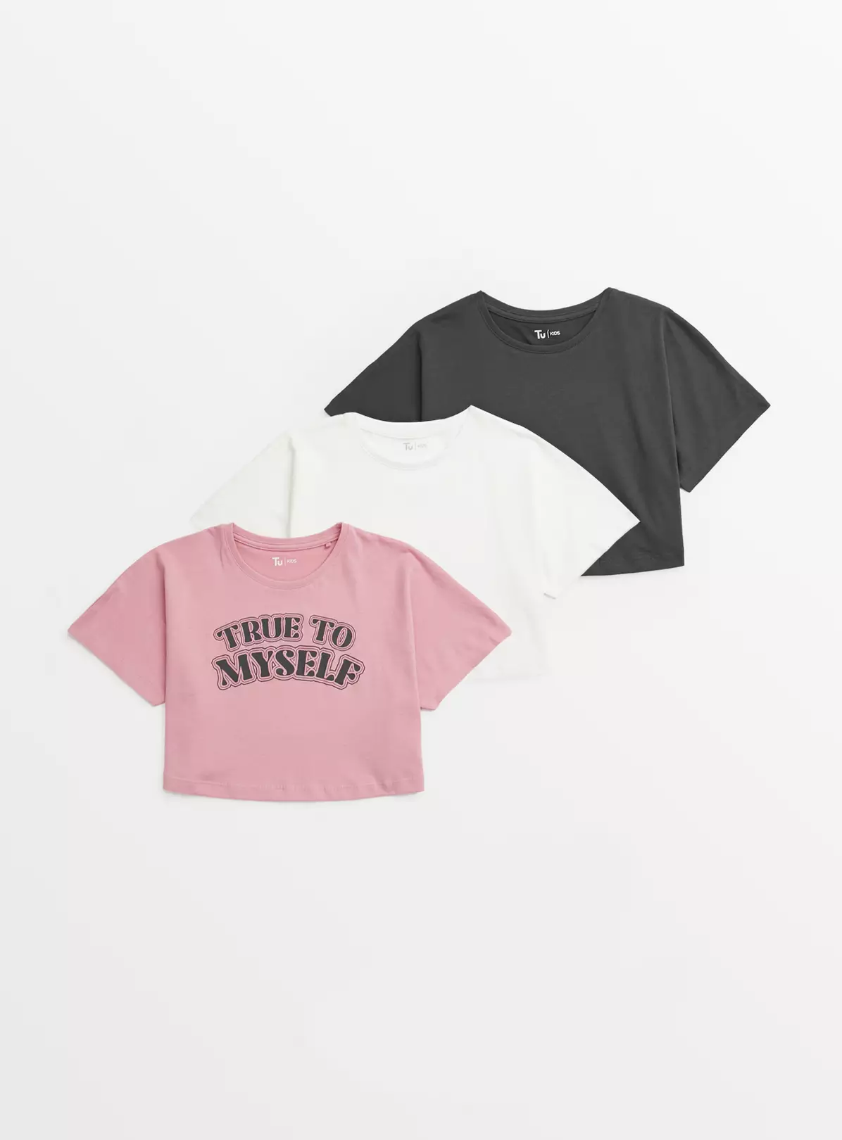 Refresh their collection with our 3 pack of cute tees! This pack includes 1 white, 1 dark grey and 1 pink t-shirt. Crafted from a comfy cotton, the pink t-shirt features a ‘True To Myself’ slogan on the front. What’s not to love?