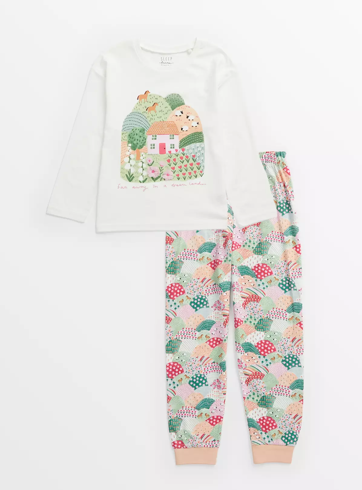 Your little one can drift off to sleep in our super cute pyjamas. Made from pure cotton, they have a crew neck, long sleeves and feature an adorable dream-like cottage scene with slogan and coordinating printed bottoms. They’ll love them!