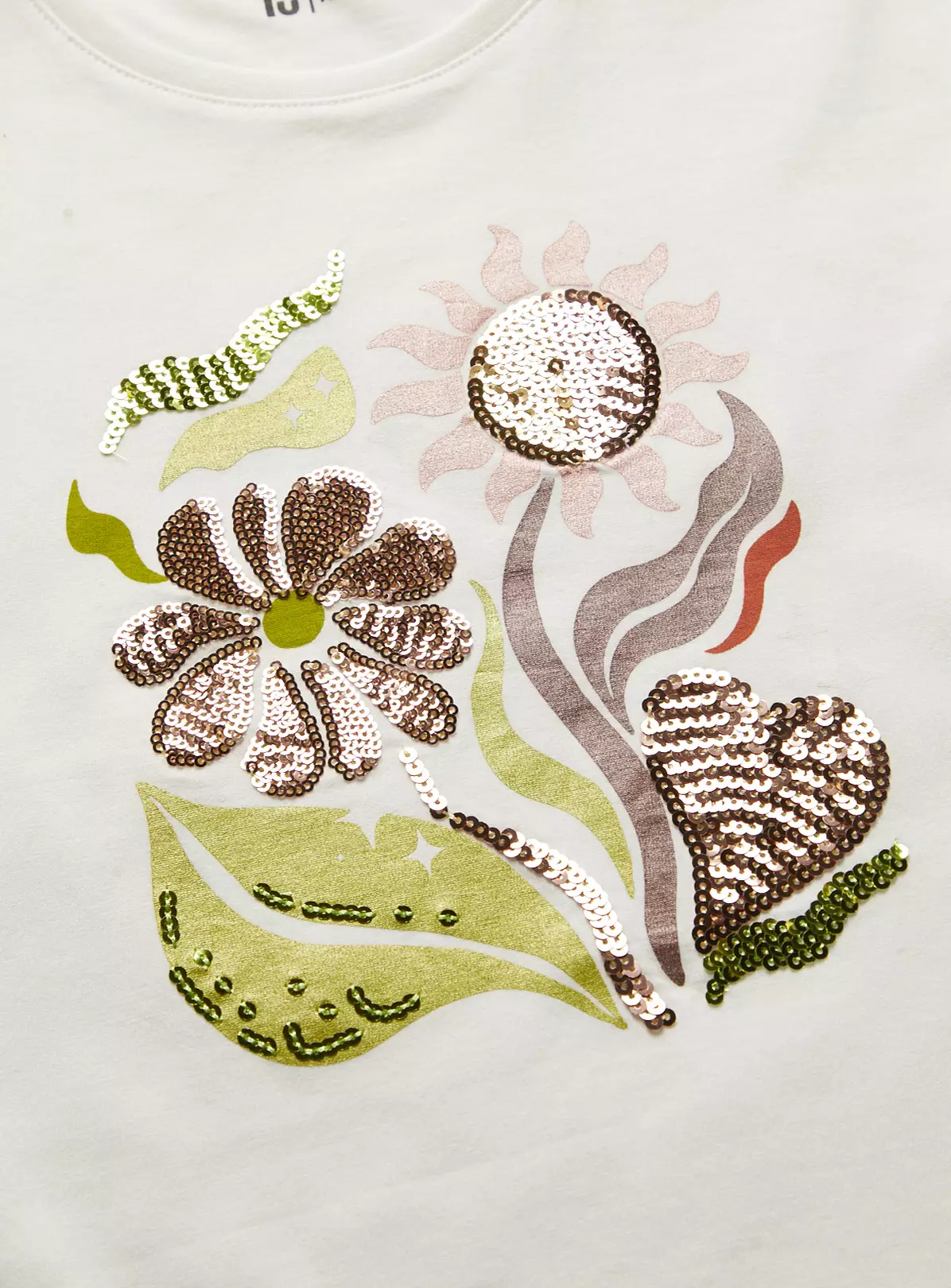 Our cream short sleeve t-shirt features a sequinned floral design for an extra fun look! Crafted from cotton, it’s a comfy and cute option for their weekend wardrobe. Team it with their denim jeans and a pair of sparkly trainers for the ultimate outfit.