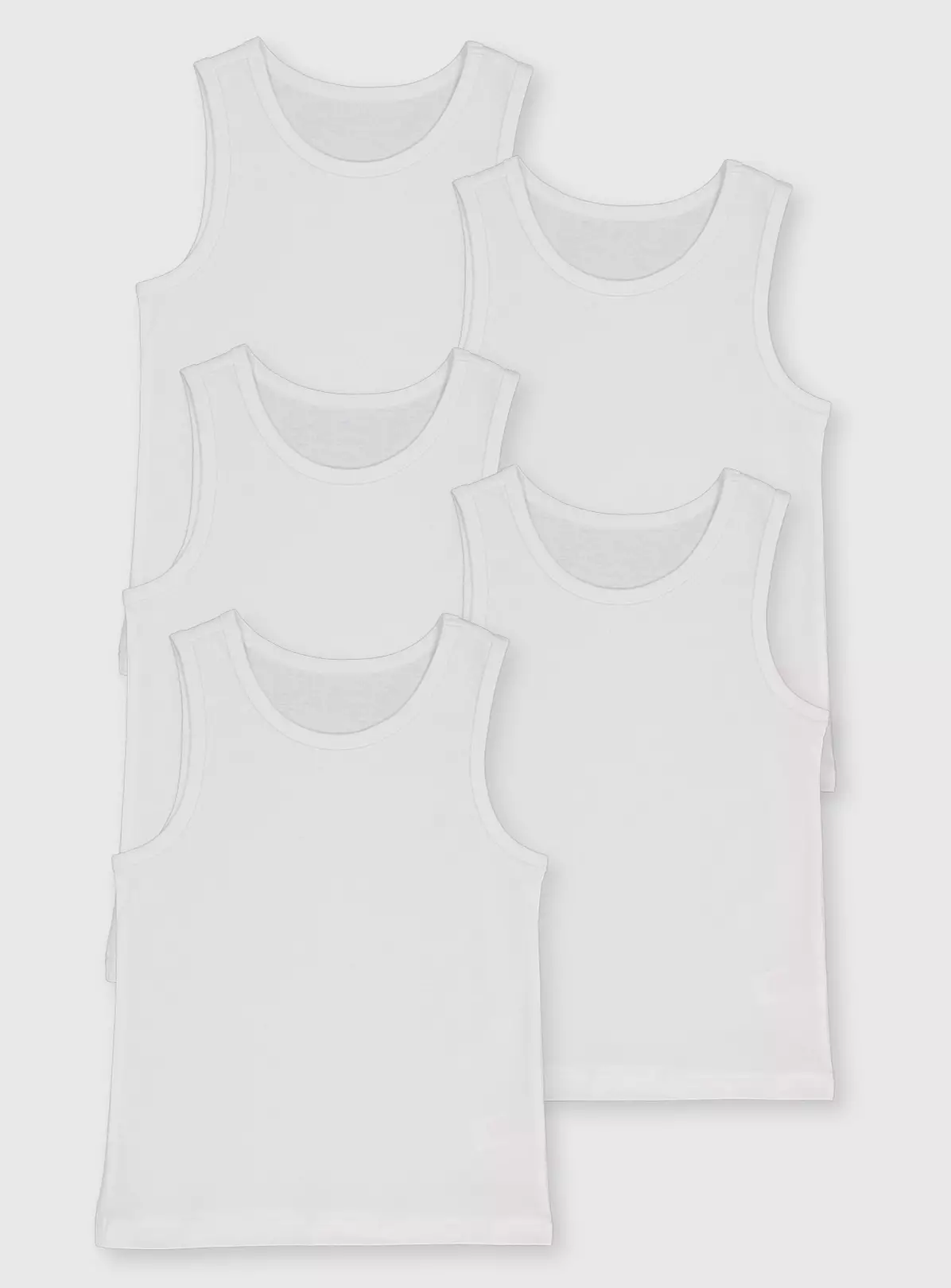 Stock up on some of their essentials with this handy five pack of classic vests. In pure white cotton, these sleeveless vests are a great option for school or everyday casual wear. They make the perfect layering piece in winter too!